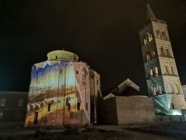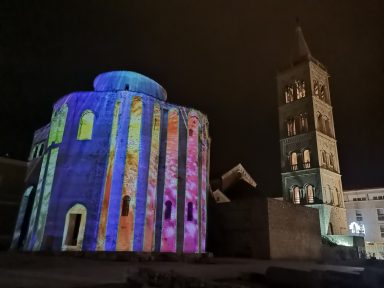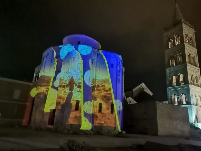 Danas, večeras, Sv.Donat nas je očarao spojem antički povijesnog i tehnološki modernoga, laserskim projekcijama zabljesnuo je u posebnom sjaju, predočujući nam slikicama i iskonski blagdanski duh Božića i nenadmašnu krasotu Zadra.