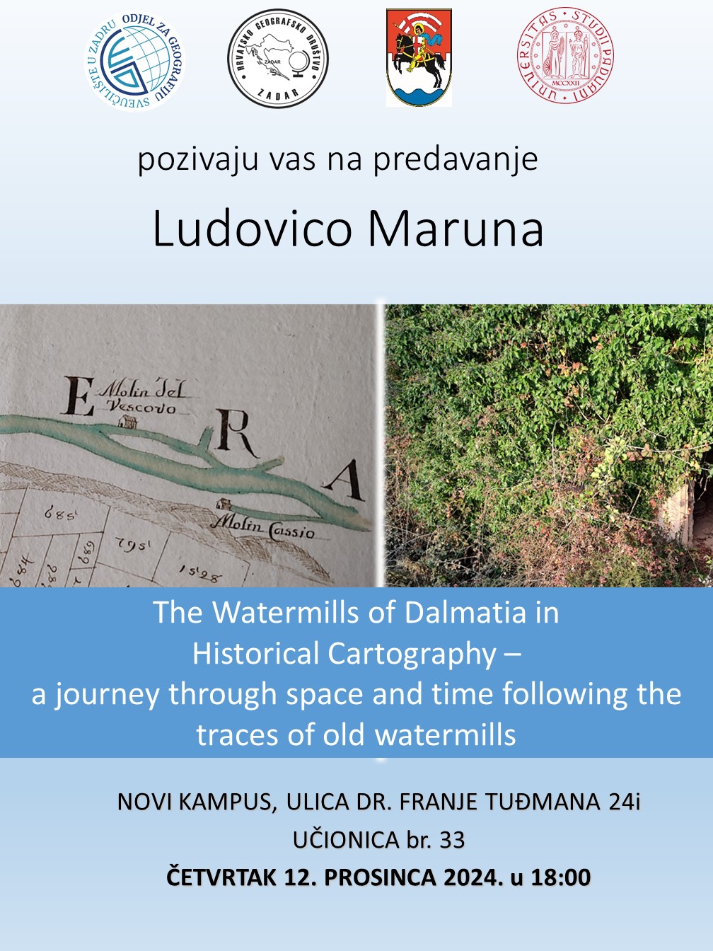 Sveučilište u Zadru poziva nas na predavanje koje će održati Ludovico Maurina “The Watermills of Dalmatia in Historical Cartography – a journey through space and time following the traces of old watermills” u četvrtak 12. prosinca 2024. u 18 sati na Odjelu za geografiju u učionici br. 33.