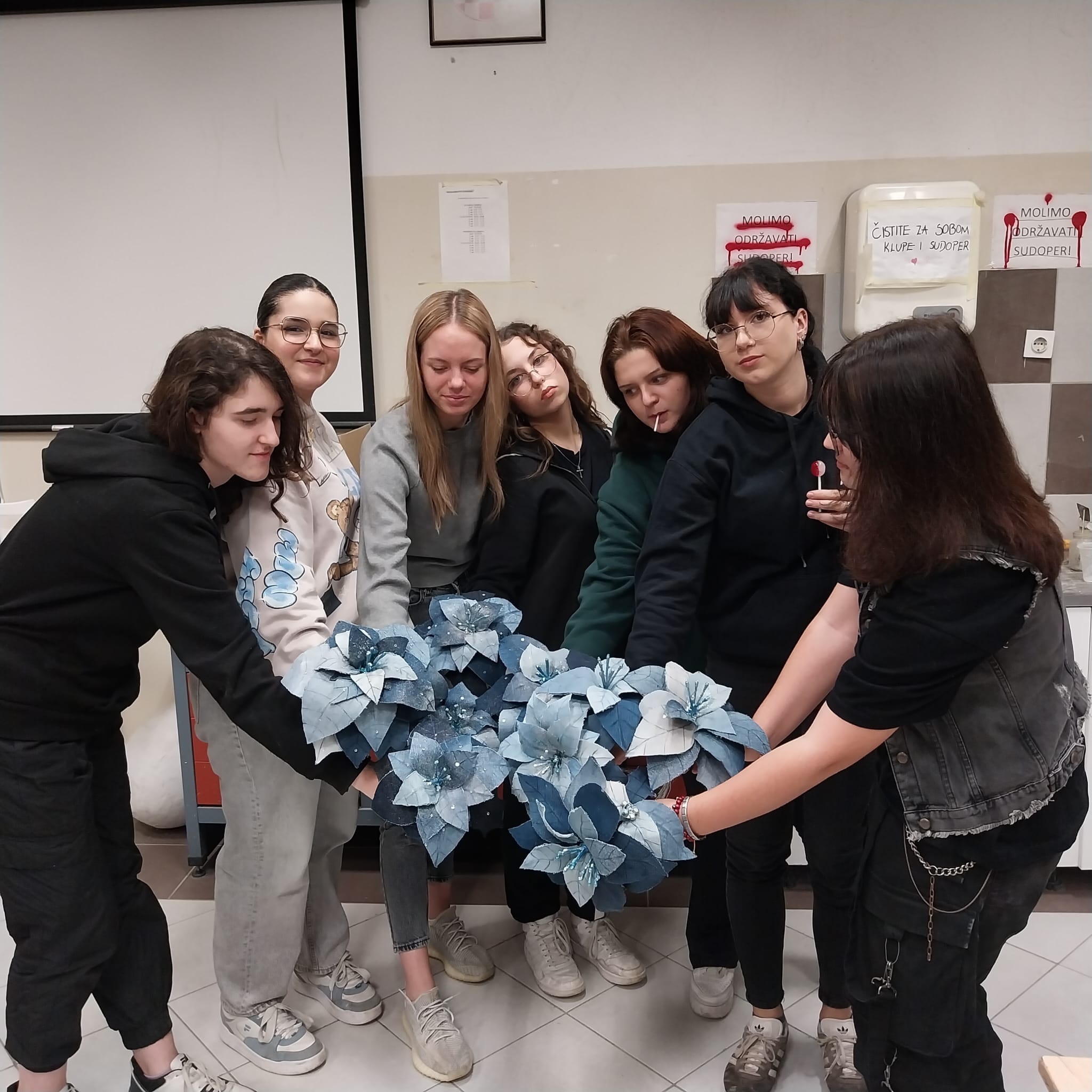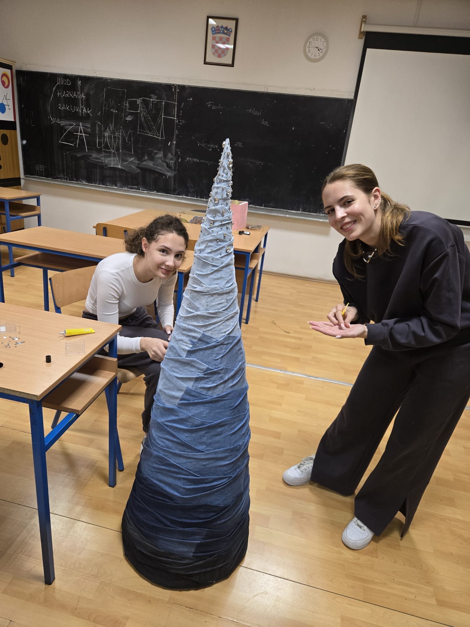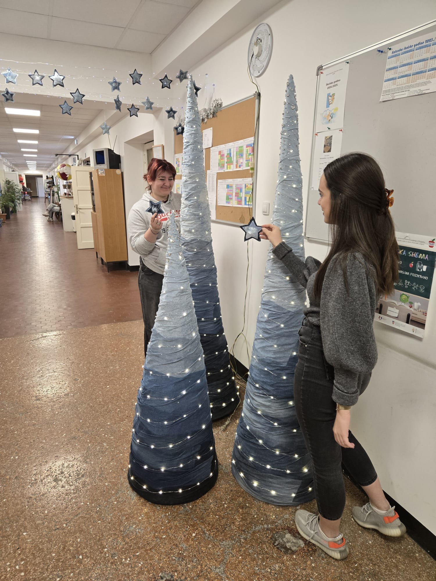“Naše ovogodišnje božićno ruho nije samo posebno, nego ima i važnu poruku… Ono je napravljeno od trapera. Zašto? Jer smo mi svi jeans generacija! Ma ne, naša škola je mjesto kreativnosti, ali i mjesto gdje se njeguju plemenite ideje. Ideja ovogodišnje božićne dekoracije nosi poruku ponovnog korištenja odjevnog predmeta nakon što je odbačen. Posebice stare traperice, nismo željeli da završe na otpadu. Zašto? Svi znamo da je traper je glavni dio garderobe milijuna ljudi diljem svijeta! Ljudi toliko često nose traperice, traper jakne i druge komade da materijal uzimaju zdravo za gotovo. Međutim, vrlo je malo onih koji su ikada zastali i razmislili o utjecaju odjeće od trapera na okoliš. Industrija trapera poznata je po iznimno visokoj potrošnji vode, energije i kemijskom zagađenju. Zapravo, to je jedan od ekološki najštetnijih sektora u modnoj industriji. Kako bi smanjile pritisak na zemlju, razne tvrtke su preuzele različite strategije u suočavanju s trapericama i tkaninama, mijenjajući namjenu tih materijala u nešto novo. Zato nas još više veseli činjenica što ove jelke i dekoracije neće biti odbačene nakon Božića, nego će čekati neke nove uloge, možda u kakvoj predstavi, tko zna?”
