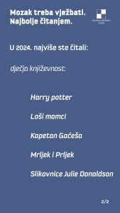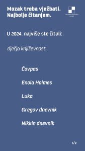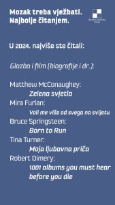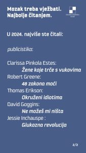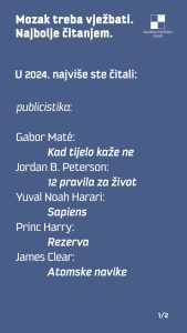 E, pa evo što su Vaši kolegice i kolege po hobiju i kulturnoj ljubavi najviše prošle godine držali u rukama, prelistavajući pomno, s pozornošću i ushitom među debelim ili tankim koricama. Ali i slušali, gledali, razgledavali u Gradskoj knjižnici Zadar…