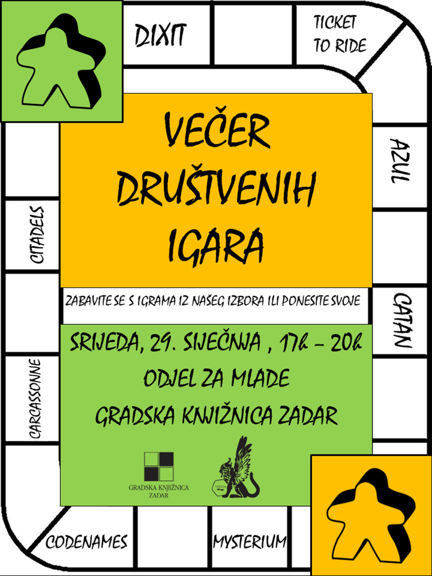 U srijedu, 29. siječnja 2025. od 17 do 20:00 na Odjelu za mlade Gradske knjižnice Zadar održat će se Večer društvenih igara. Posjetitelji će imati priliku zaigrati društvene igre iz fonda Knjižnice, ali i igre koje će priskrbiti udruga „Sfinga“ iz svoje kolekcije. Također, posjetitelji mogu ponijeti i svoje igre kako bi ih podijelili s drugima.