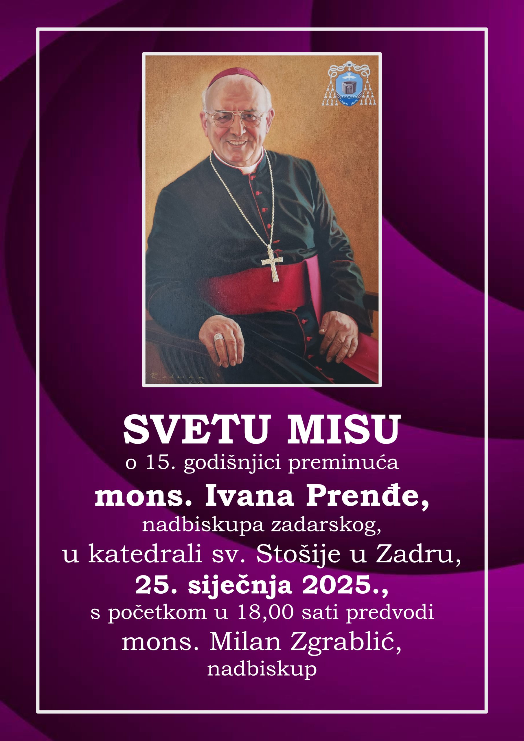 Na 15. godišnjicu smrti zadarskog nadbiskupa Ivana Prenđe, u subotu, 25. siječnja, misu zadušnicu u katedrali sv. Stošije u Zadru s početkom u 18 sati predvodi zadarski nadbiskup Milan Zgrablić.