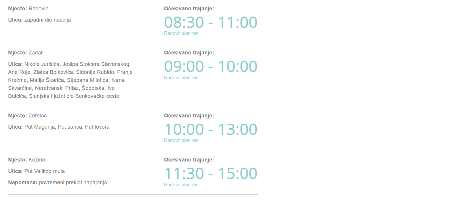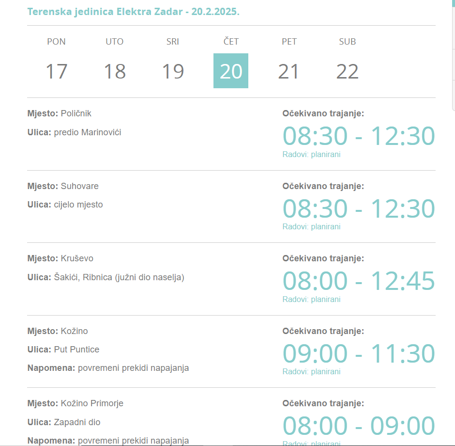 Elektra Zadar izvijestila je o privremenoj obustavi isporuke el.energije zbog izvođenja radova sutra, u četvrtak, 20. veljače, na području više županijskih naselja i ulica.
