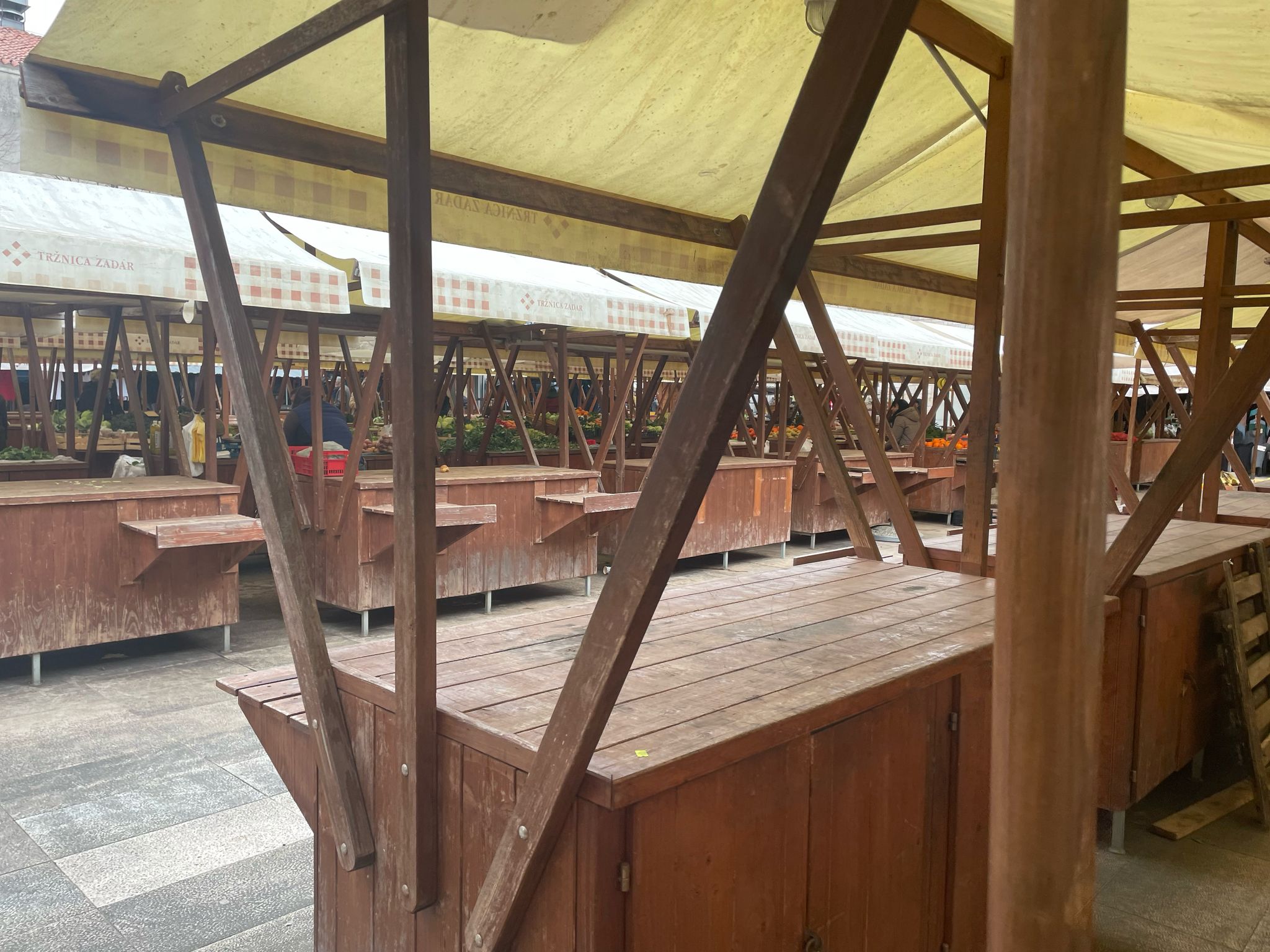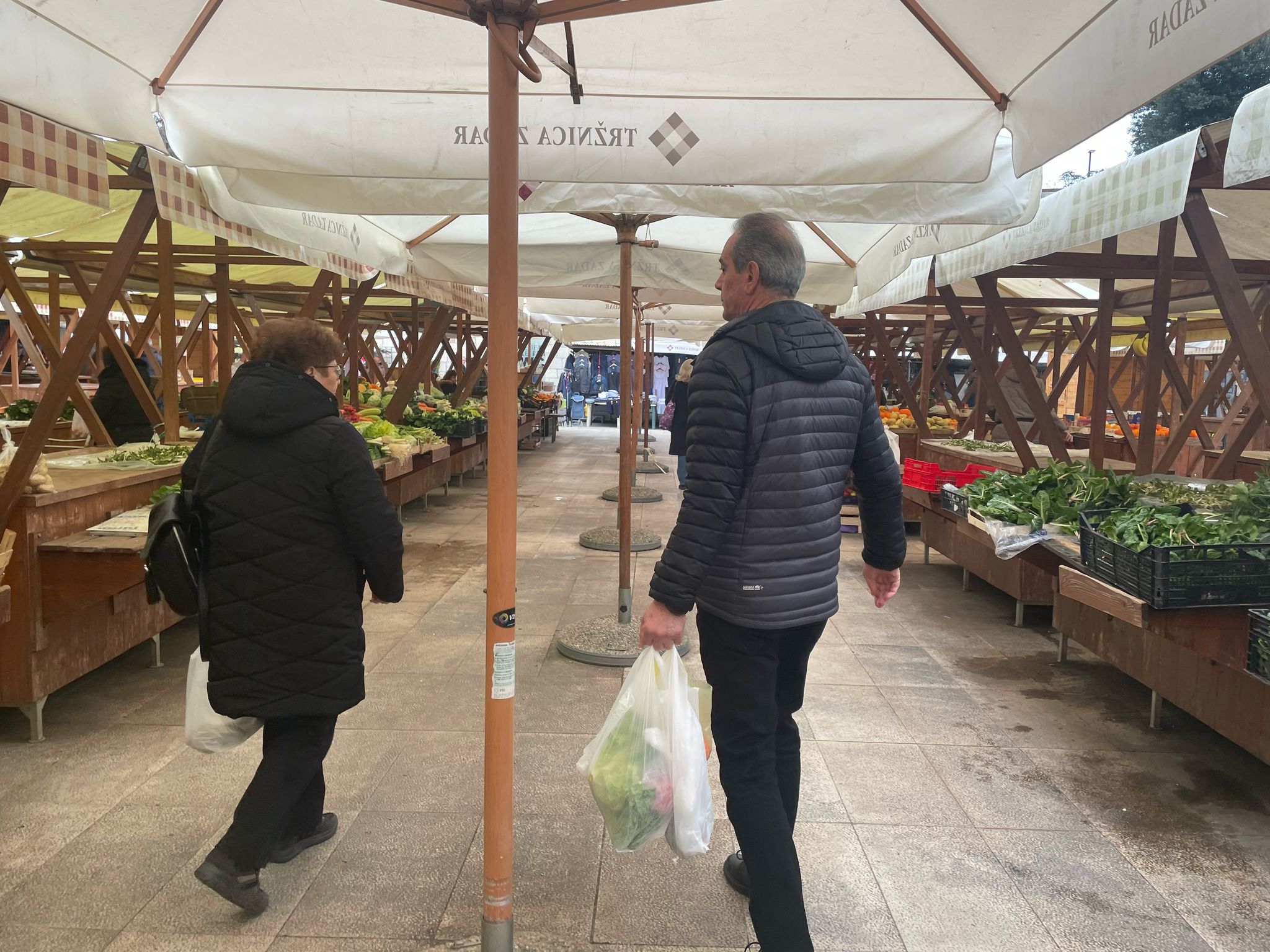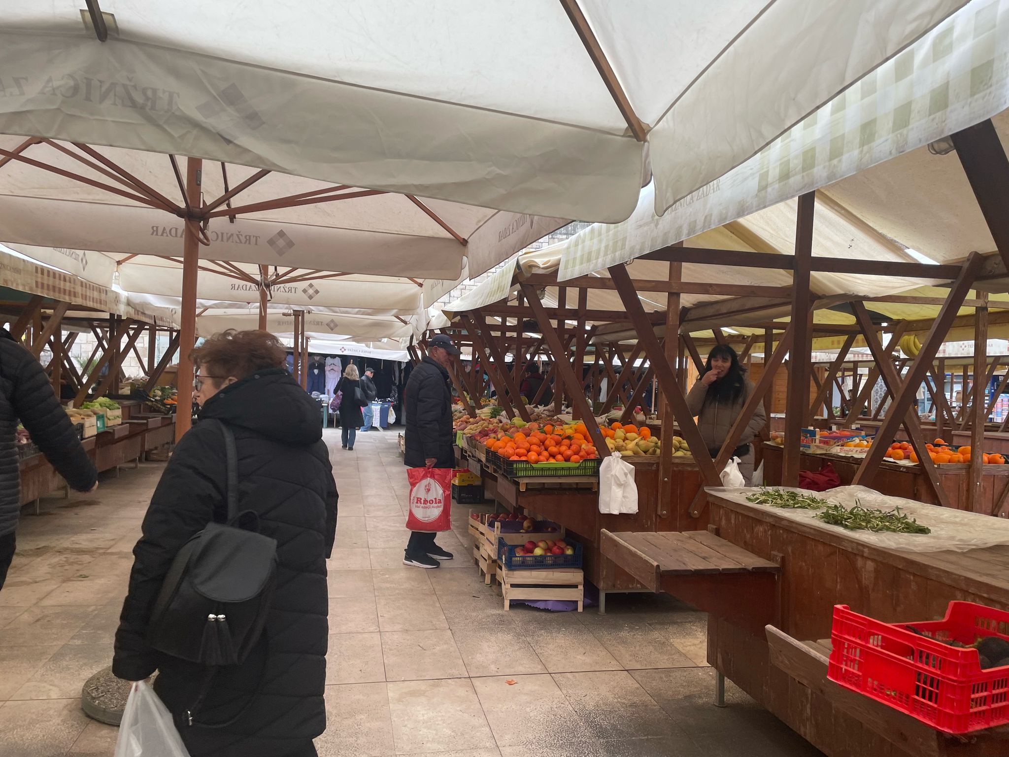 Zadarska gradska pijaca danas izgleda uspavano. Hladan zrak reže obraze, a nad stolovima s povrćem lepršaju plastične reklame, kao najdinamičniji prizor. Gdje su inače glasni povici prodavača i gužva između štandova, danas se tek povremeno čuje gacanje cipela po mokrim pločama.