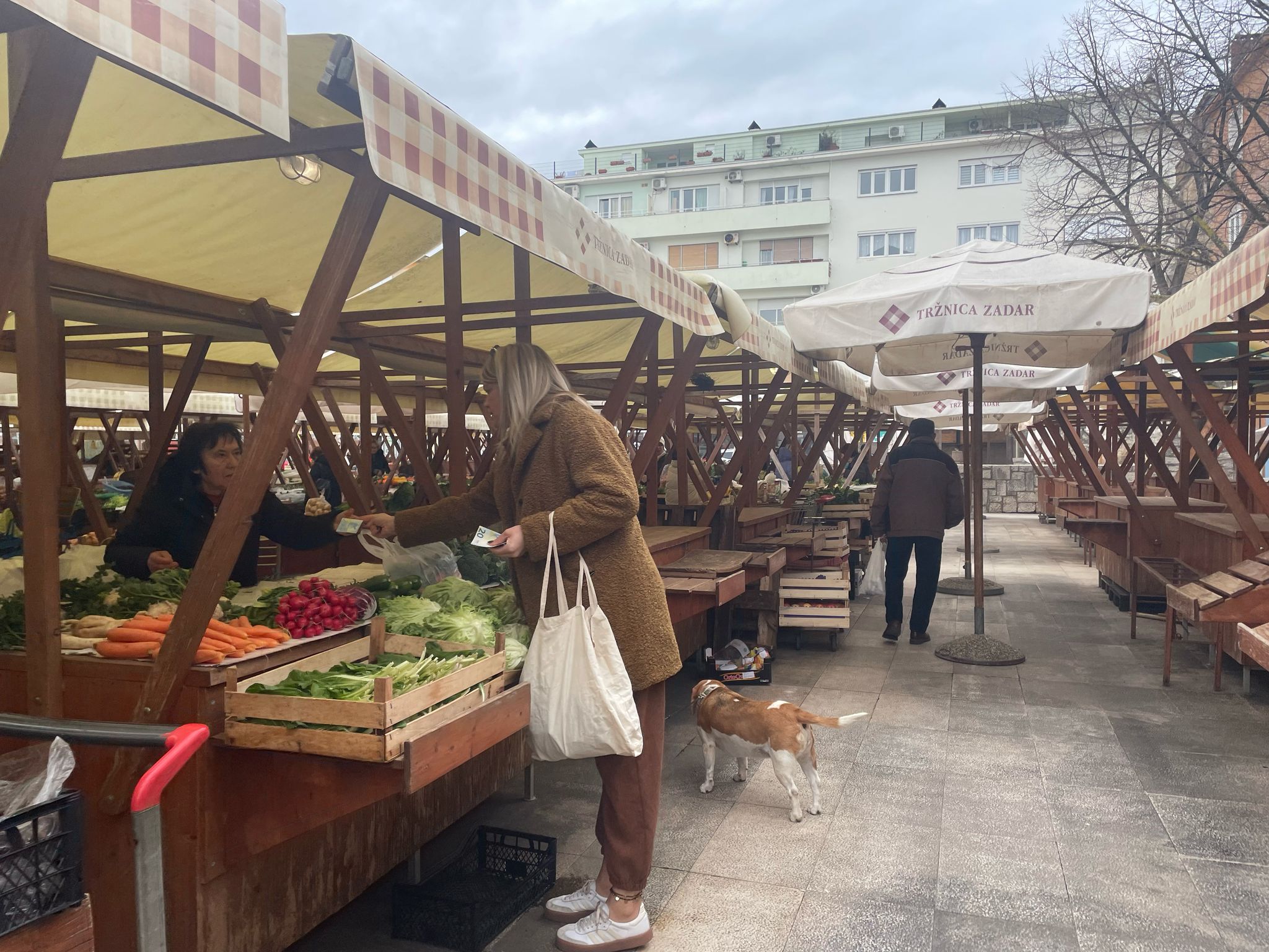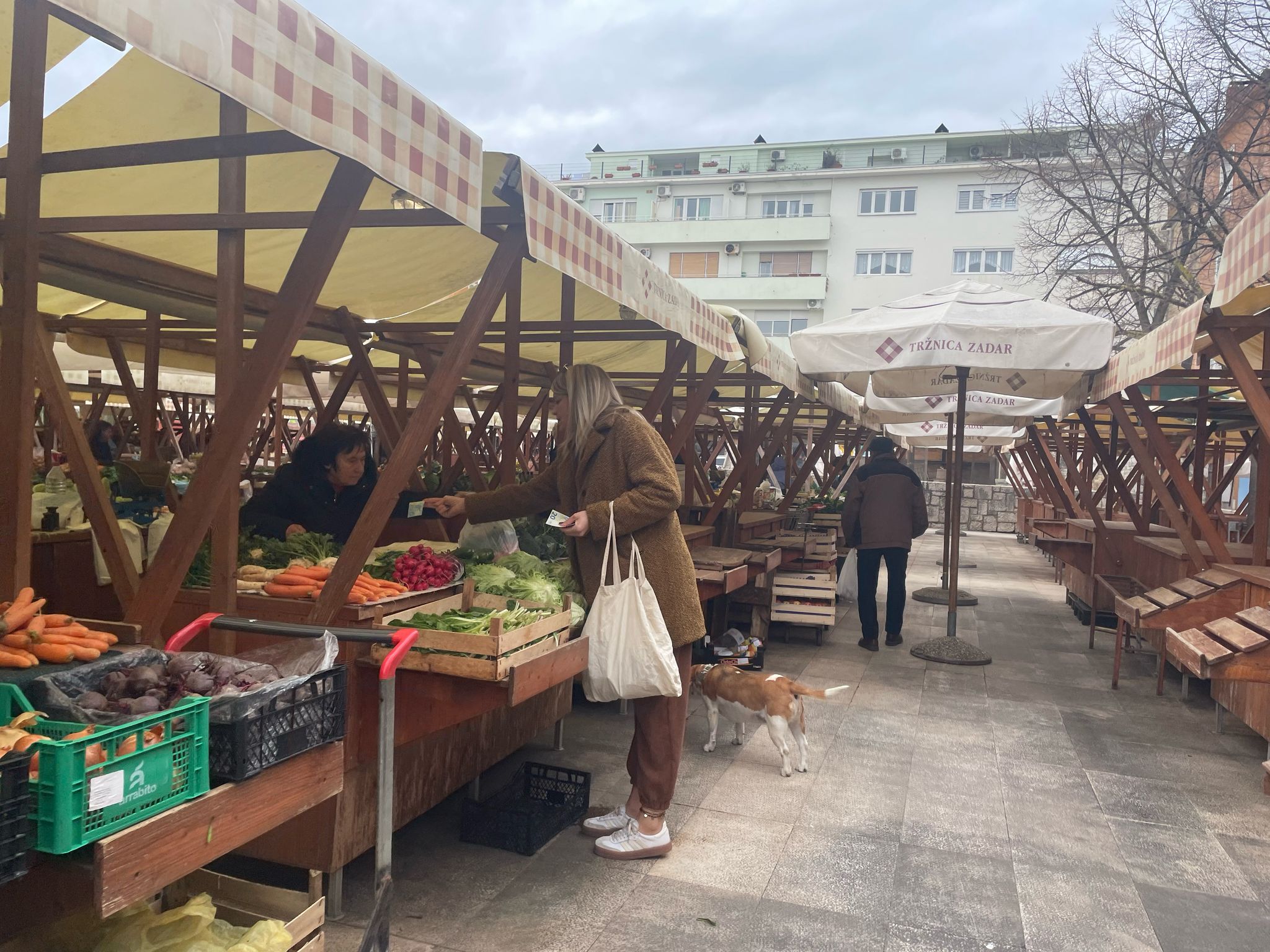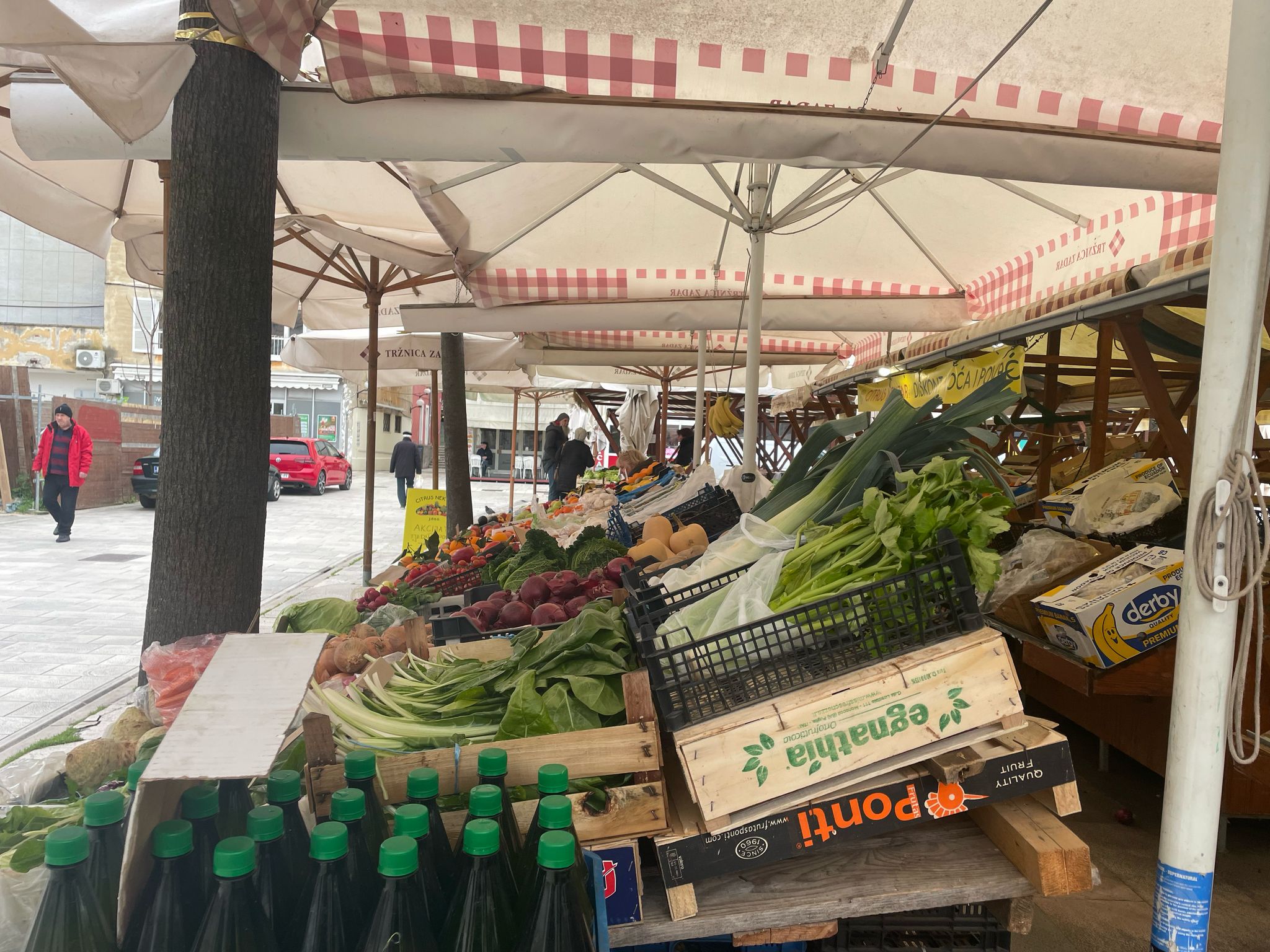 Zadarska gradska pijaca danas izgleda uspavano. Hladan zrak reže obraze, a nad stolovima s povrćem lepršaju plastične reklame, kao najdinamičniji prizor. Gdje su inače glasni povici prodavača i gužva između štandova, danas se tek povremeno čuje gacanje cipela po mokrim pločama.