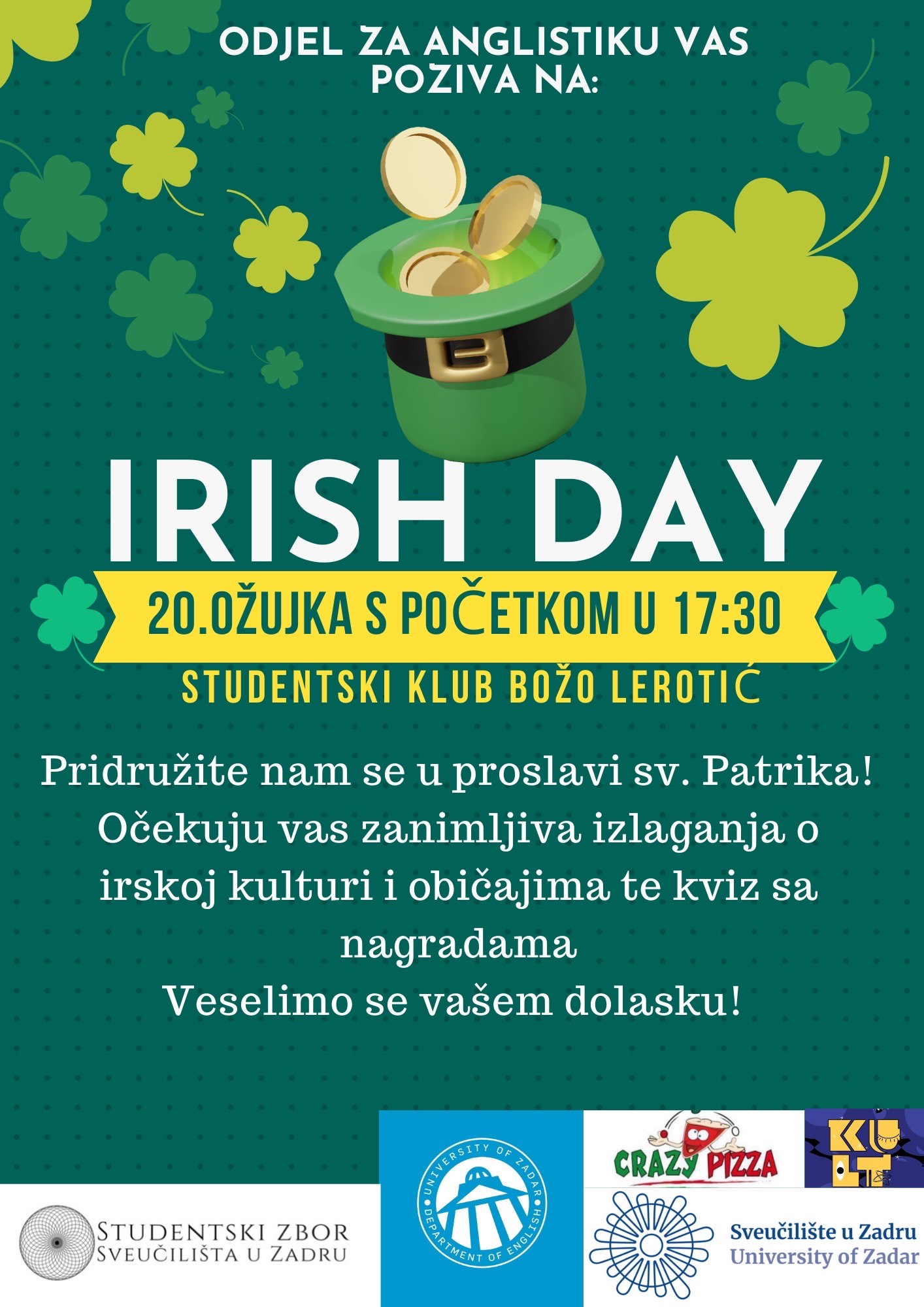 U organizaciji Odjela za anglistiku Sveučilišta u Zadru u četvrtak 20. ožujka, s početkom u 17:30 sati, u Studentskom klubu Božo Lerotić održat će se tradicionalni Irski dan.