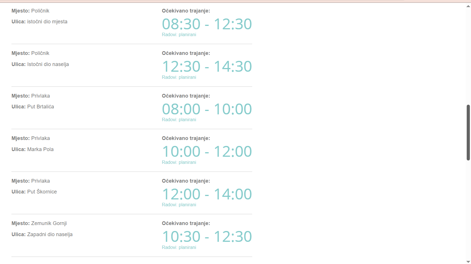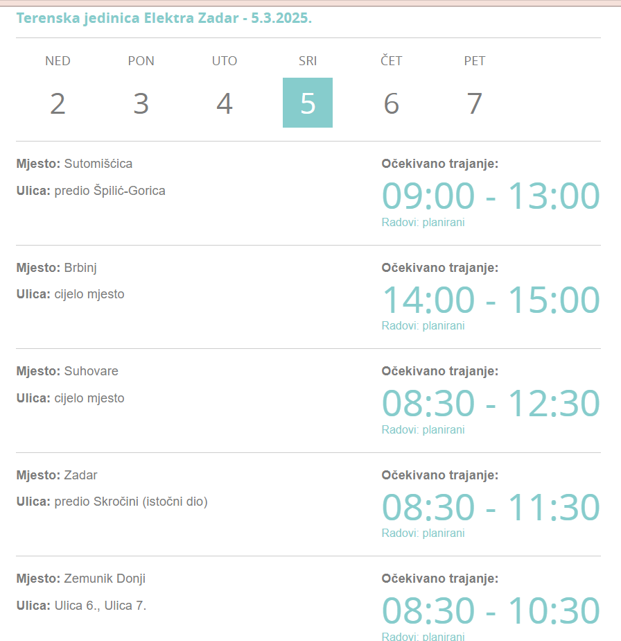 Elektra Zadar izvijestila je o privremenoj obustavi isporuke el.energije zbog izvođenja radova sutra, u srijedu, 5.ožujka, na području više županijskih naselja i ulica.