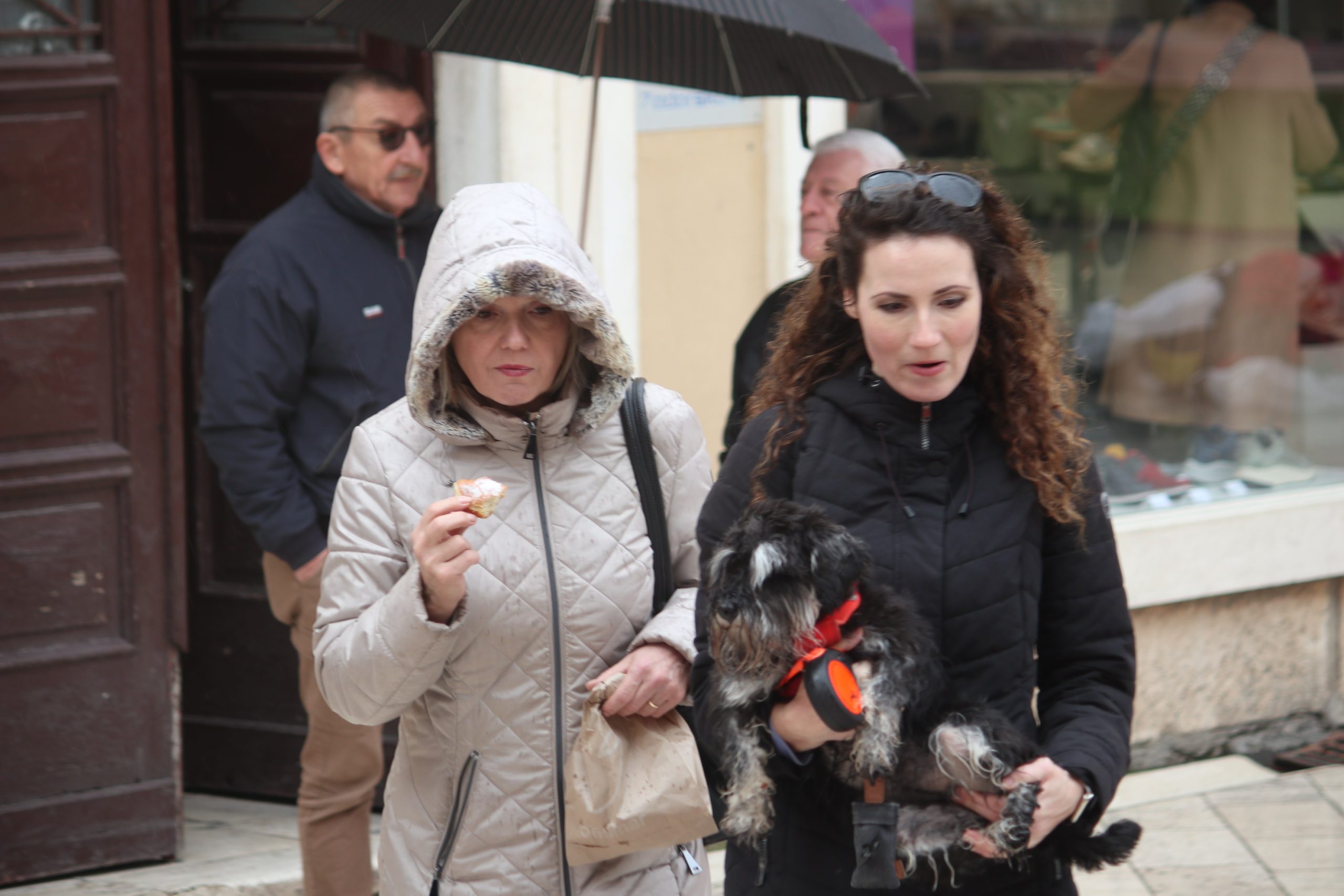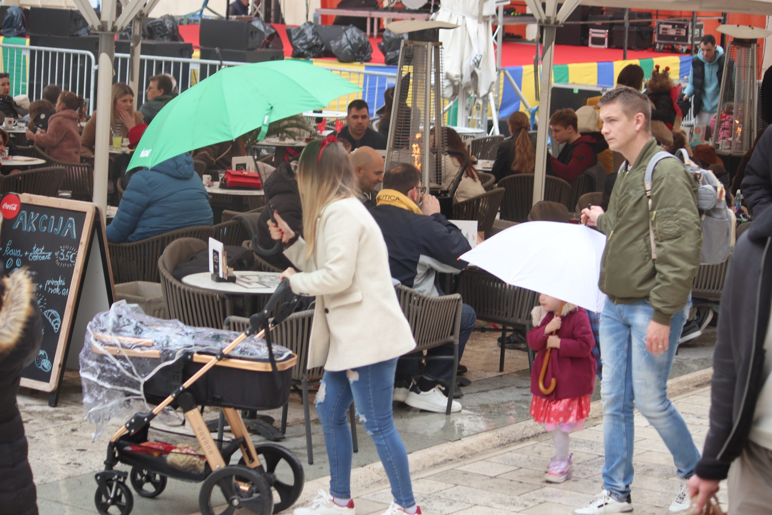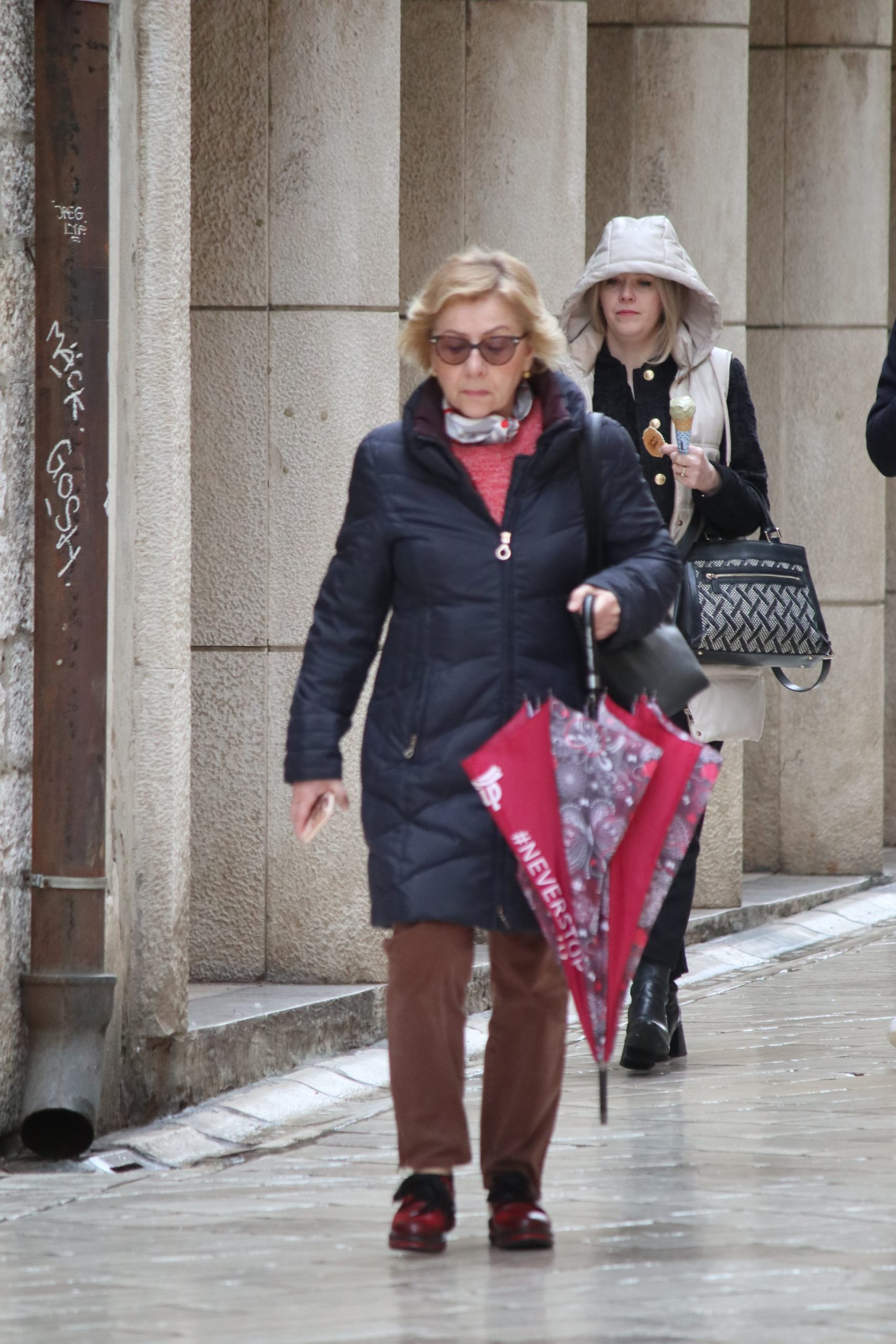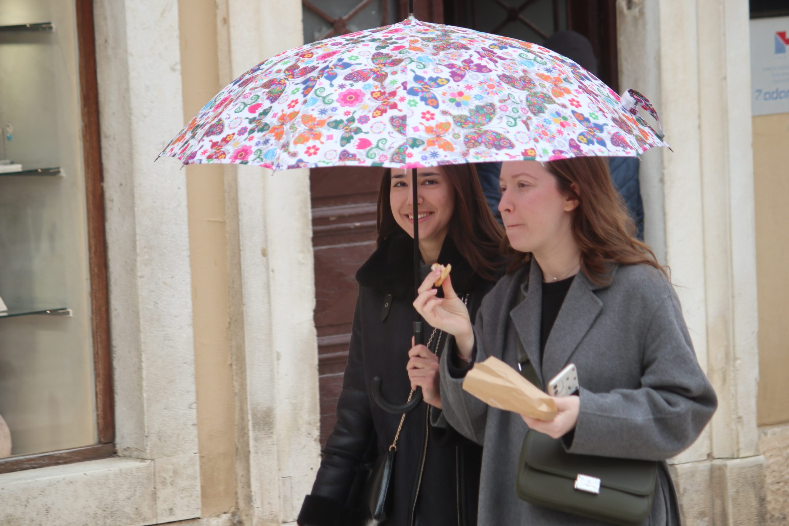 U ćakuli i komentarima o Amerima i Rusima, pride Ukrajincima, Trumpu i Zelenskom, Jupi i Gattuzu, kiši, buri, izborima i maškarama, punici, svekrvi, maloj dici s malim i velikoj s velikim brigama, i tako to u sto puta gori-doli Kolona-Forum-Kolona, hodalo se sve više i više u jaknama i tenisicama, tamnih i svijetlih tonova, ljepši spol s torbicama i boršama, muški s lumbrelama.