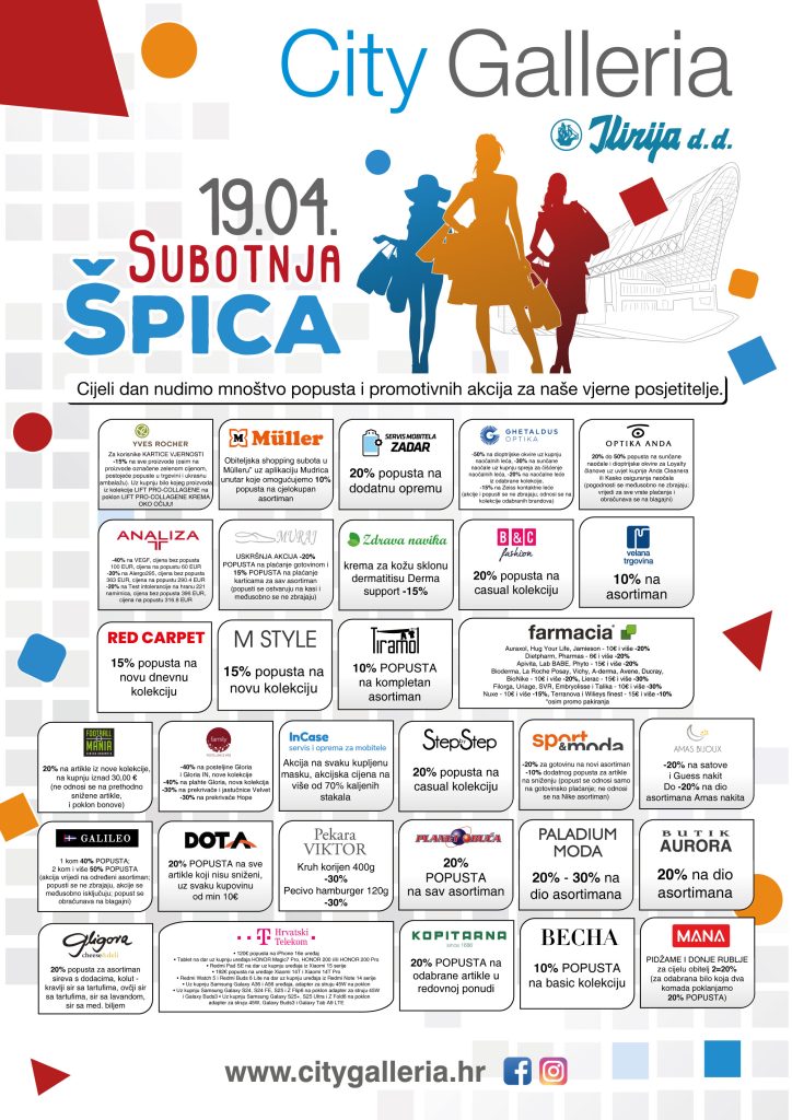 Kako bi vam olakšali blagdansku kupnju, u centru City Galleria vas ovu subotu, 19. travnja, čeka još jedna subotnja špica u kojoj cijeli dan nudimo mnoštvo popusta i promotivnih akcija za naše vjerne kupce. Brojne trgovine pripremile su posebne pogodnosti za sve naše posjetitelje kako bi svoju kupovinu obavili po što povoljnijim uvjetima, a kao i uvijek nudimo vam bogat izbor svježih i kvalitetnih namirnica na našoj unutarnjoj i vanjskoj tržnici.