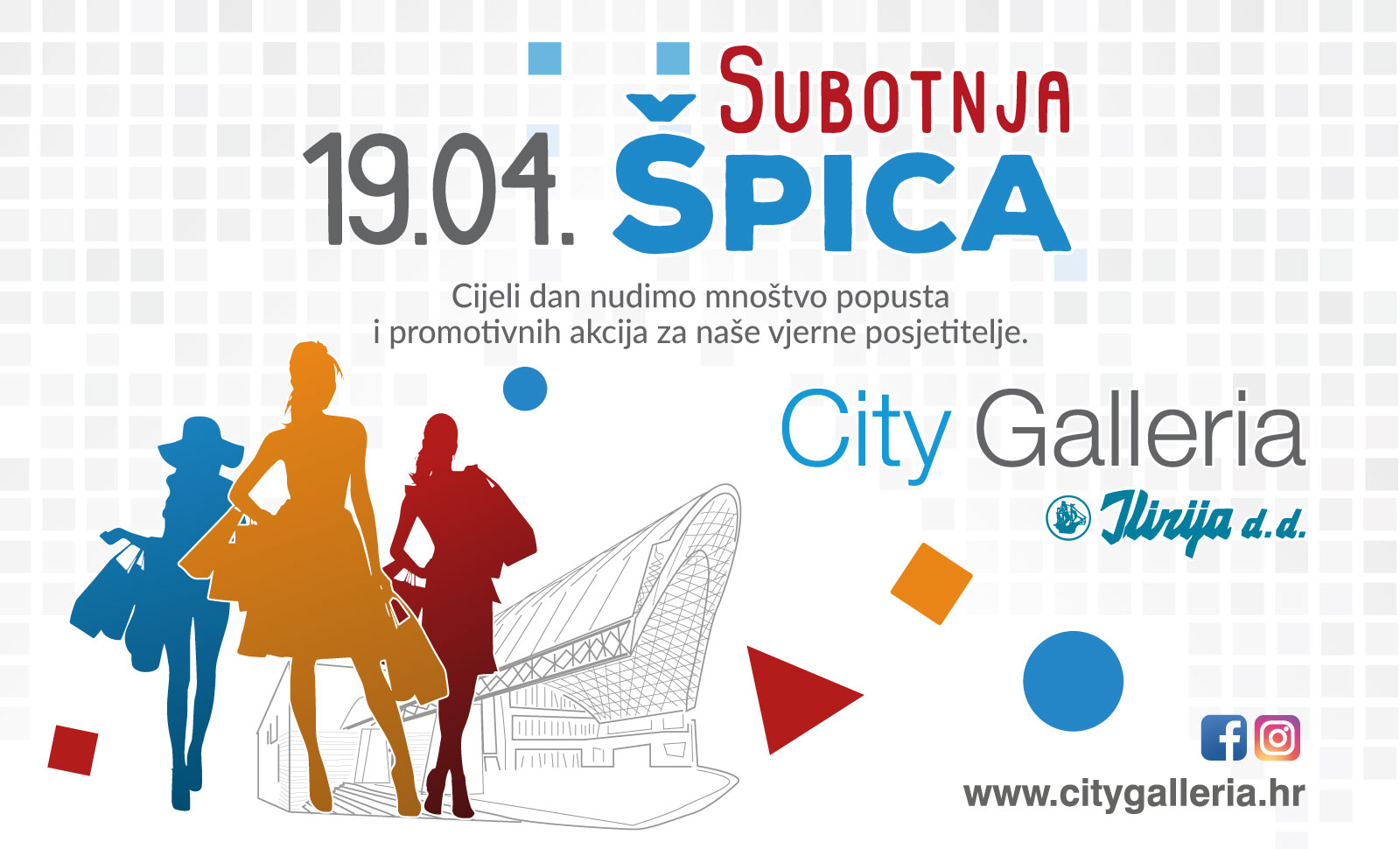 Kako bi vam olakšali blagdansku kupnju, u centru City Galleria vas ovu subotu, 19. travnja, čeka još jedna subotnja špica u kojoj cijeli dan nudimo mnoštvo popusta i promotivnih akcija za naše vjerne kupce. Brojne trgovine pripremile su posebne pogodnosti za sve naše posjetitelje kako bi svoju kupovinu obavili po što povoljnijim uvjetima, a kao i uvijek nudimo vam bogat izbor svježih i kvalitetnih namirnica na našoj unutarnjoj i vanjskoj tržnici.