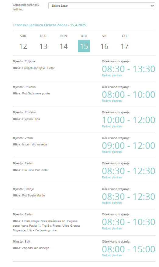 Elektra Zadar izvijestila je o privremenoj obustavi isporuke el.energije zbog izvođenja radova sutra, u utorak, 15. tranja, na području županijskih naselja i ulica.