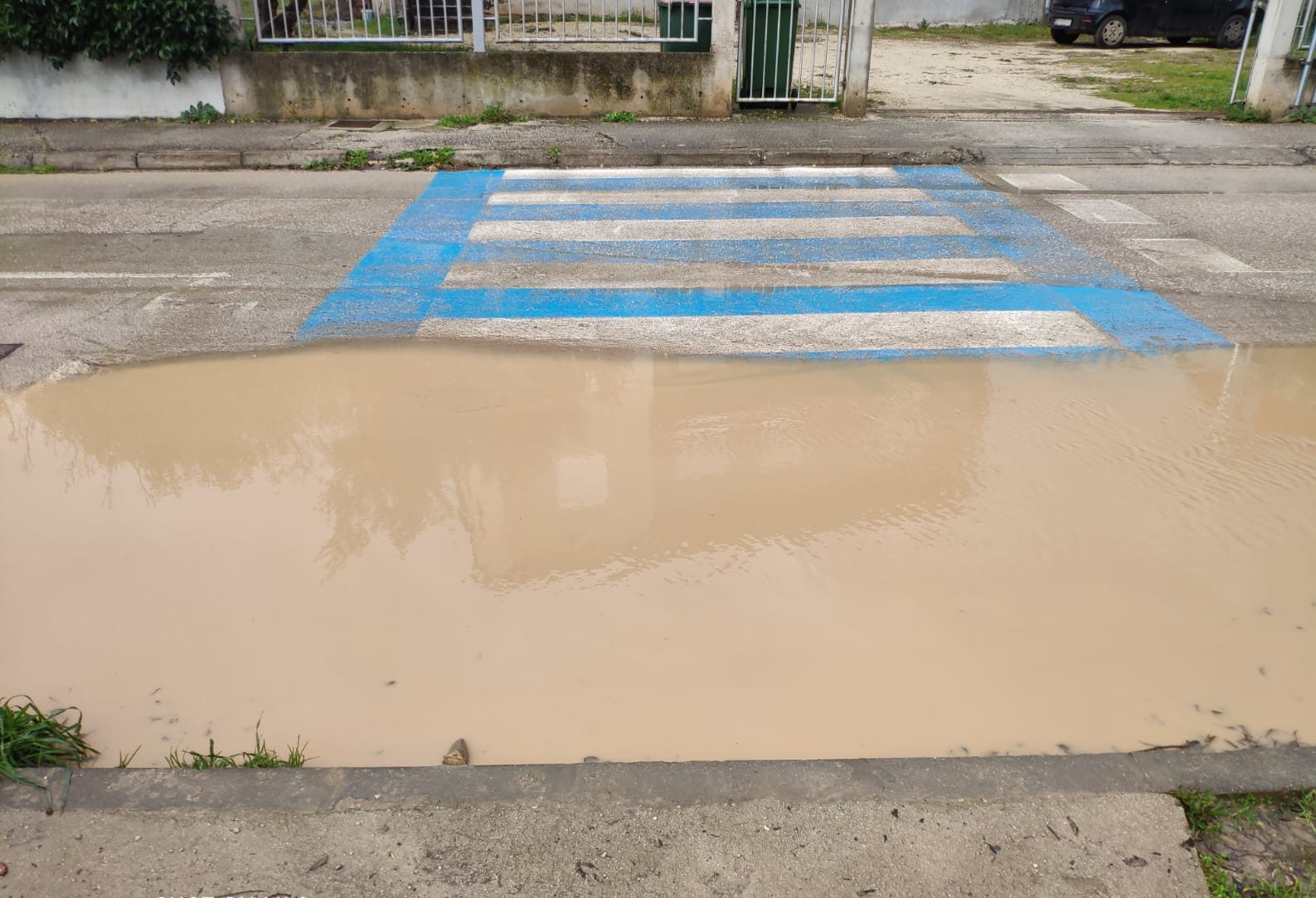 – pješački prijelaz se nalazi u udubljenom dijelu ceste i nema odvodnju – razlog zašto poplavi nakon najmanje kiše i tako stoji danima
