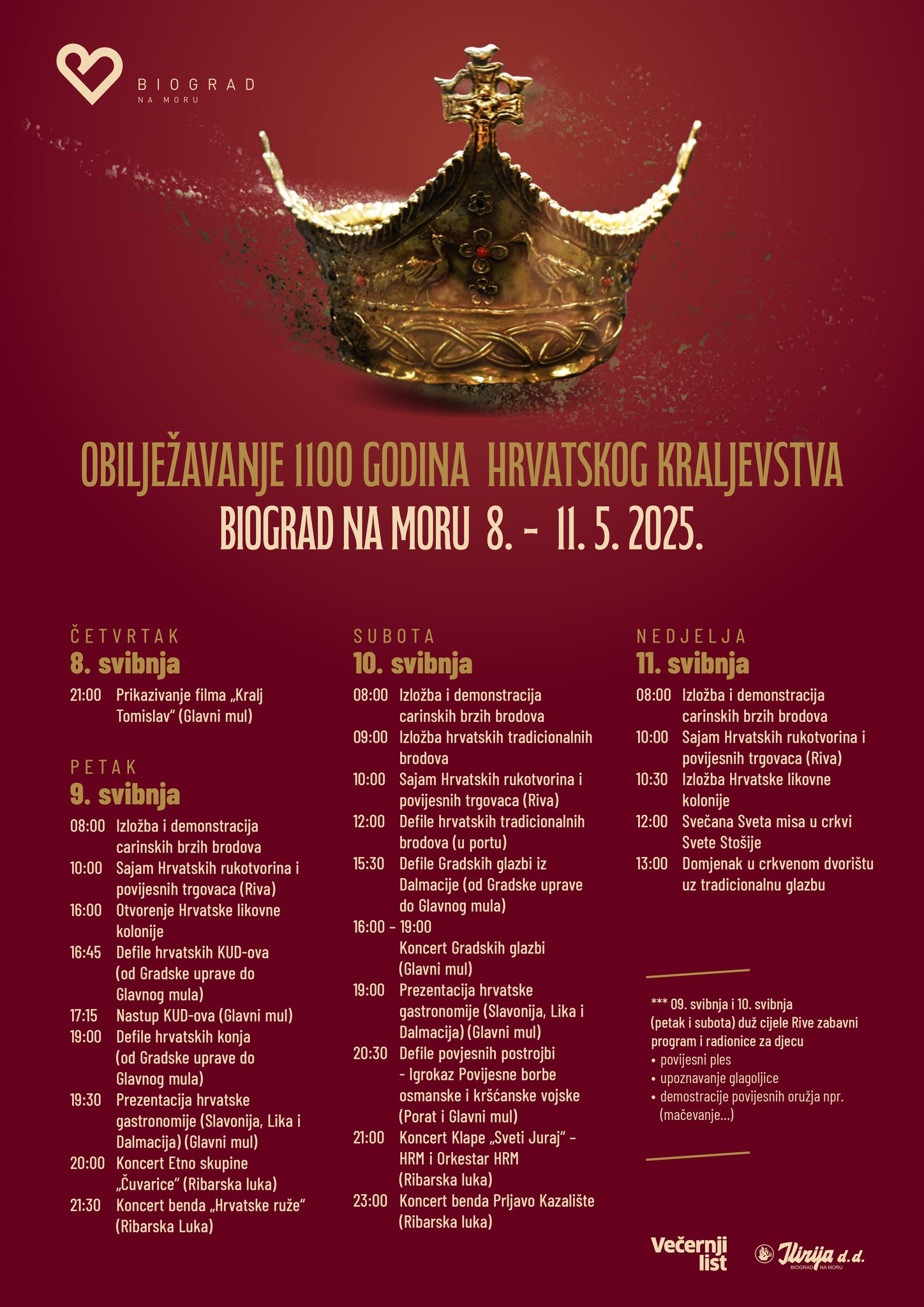 U petak, 9. svibnja 2025., Biograd na Moru postaje središte slavlja hrvatske tradicije, identiteta i glazbe. U sklopu obilježavanja 1100 godina Hrvatskog kraljevstva, grad će ugostiti niz atraktivnih događanja koja će trajati od ranih jutarnjih sati pa sve do kasne večeri, kulminirajući dvama posebnim koncertima na pozornici u Ribarskoj luci.