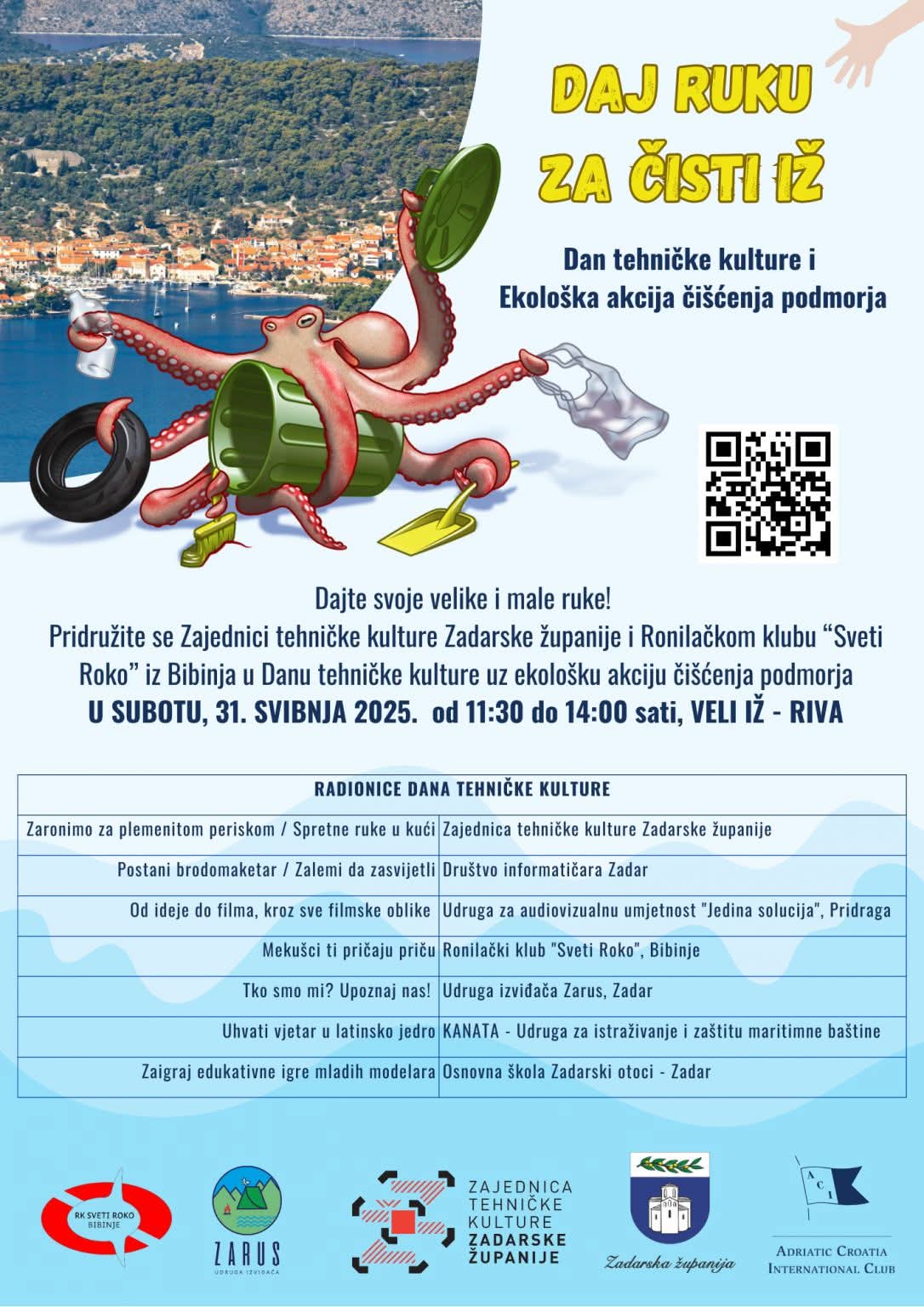 Veli Iž će ove subote, dakle sutra, 31. svibnja, ugostiti manifestaciju “Daj ruku za čisti Iž”, cjelodnevni program koji spaja tehničku kulturu, ekologiju, edukaciju i zabavu. U organizaciji Zajednice tehničke kulture Zadarske županije i Ronilačkog kluba „Sveti Roko“ iz Bibinja, na rivi u Velom Ižu od 11:30 do 14:00 sati održat će se niz aktivnosti namijenjenih djeci, mladima i odraslima.