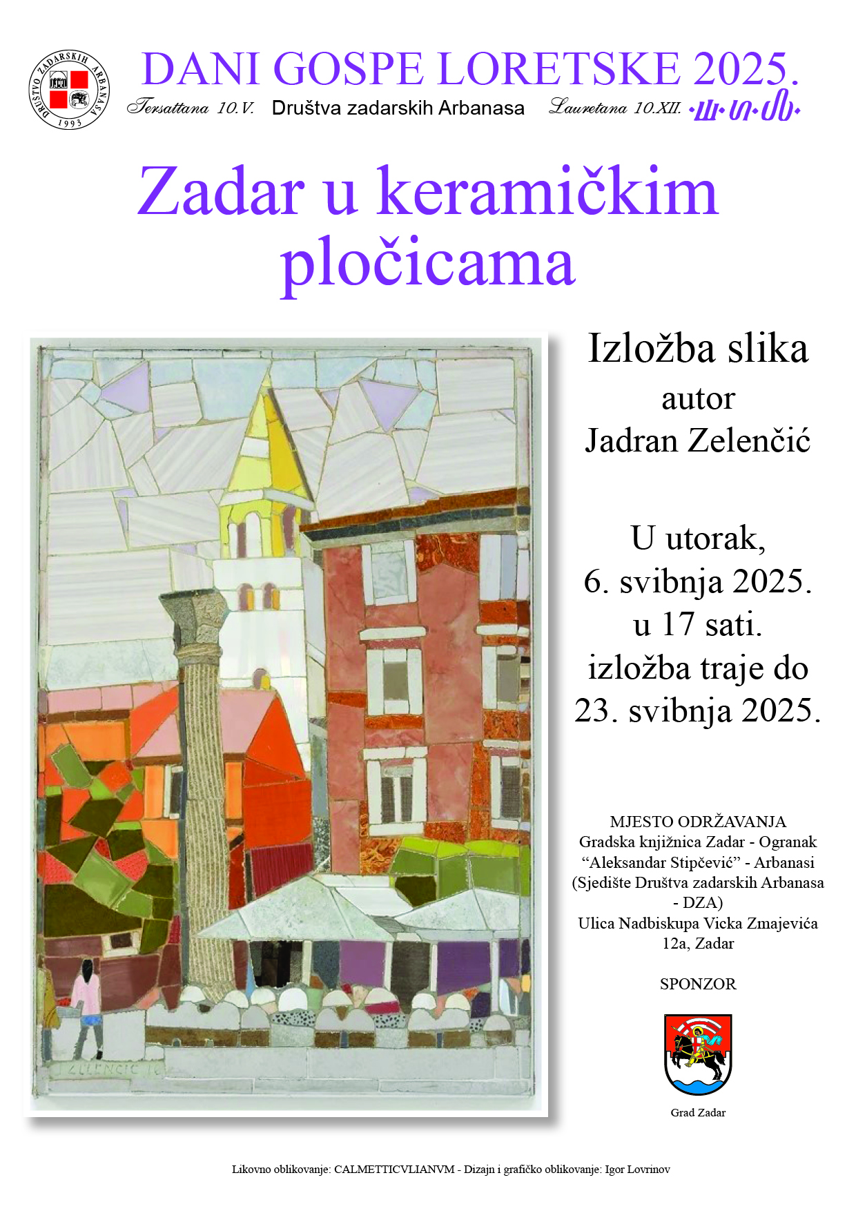 Program započinje u utorak, 6. svibnja 2025., u 17 sati, u multimedijalnoj dvorani knjižnice, svečanim otvorenjem Dana Gospe Loretske, uz uvodnu riječ dopredsjednika Društva Dorian Perovića i prigodnu projekciju, publika će imati priliku poslušati napjeve običajskog pivanja na tri arbanaška govora u izvođenju pjevača Leonarda Perovića. Istoga dana bit će otvorena i izložba slika Jadrana Zelenčića “Zadar u keramičkim pločicama”, koja će ostati otvorena do 23. svibnja 2025. u predsoblju knjižnice, upoznaju nas organizatori i domaćini događanja.