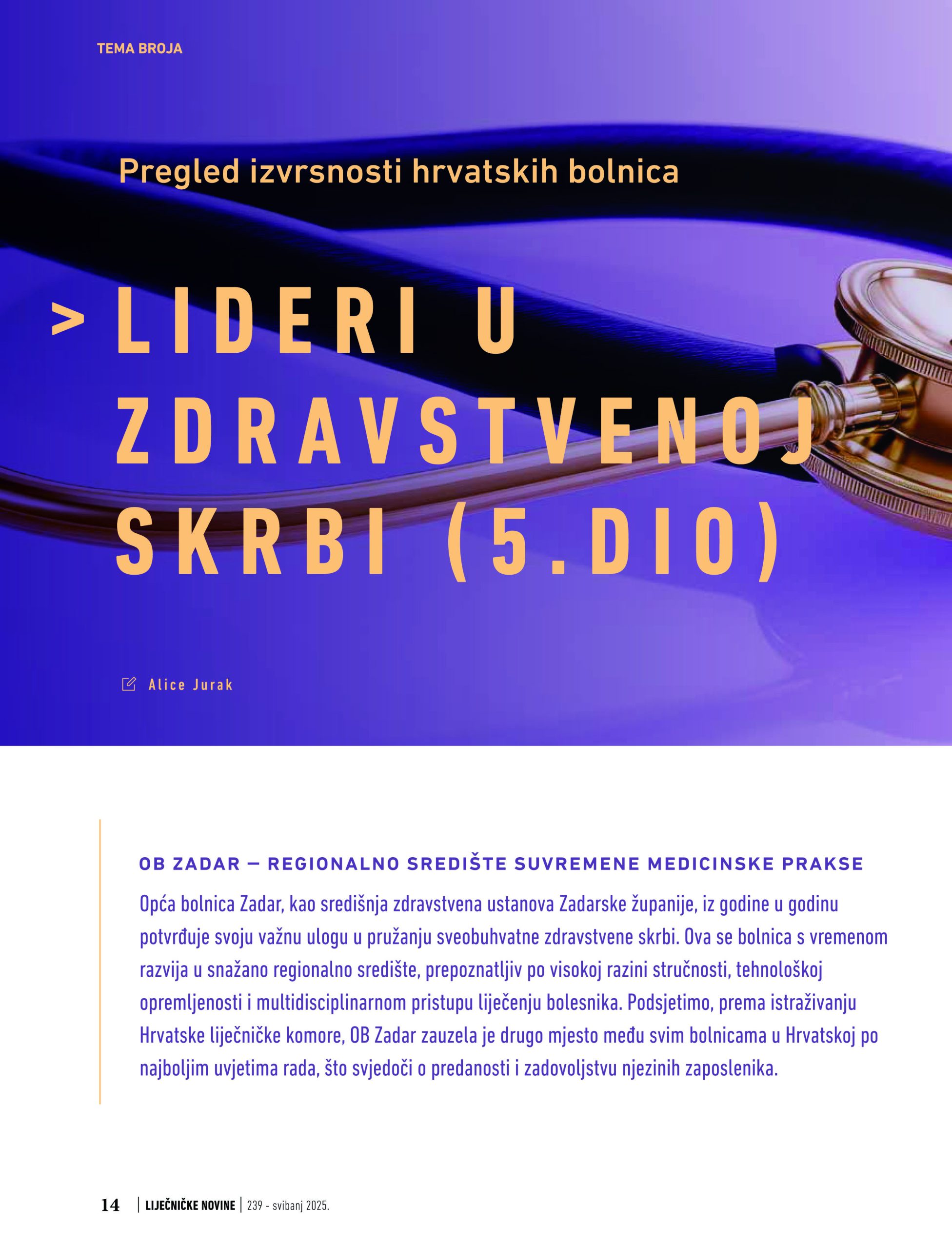 OPĆA BOLNICA ZADAR Među liderima u izvrsnosti skrbi zdravstvenih ustanova RH