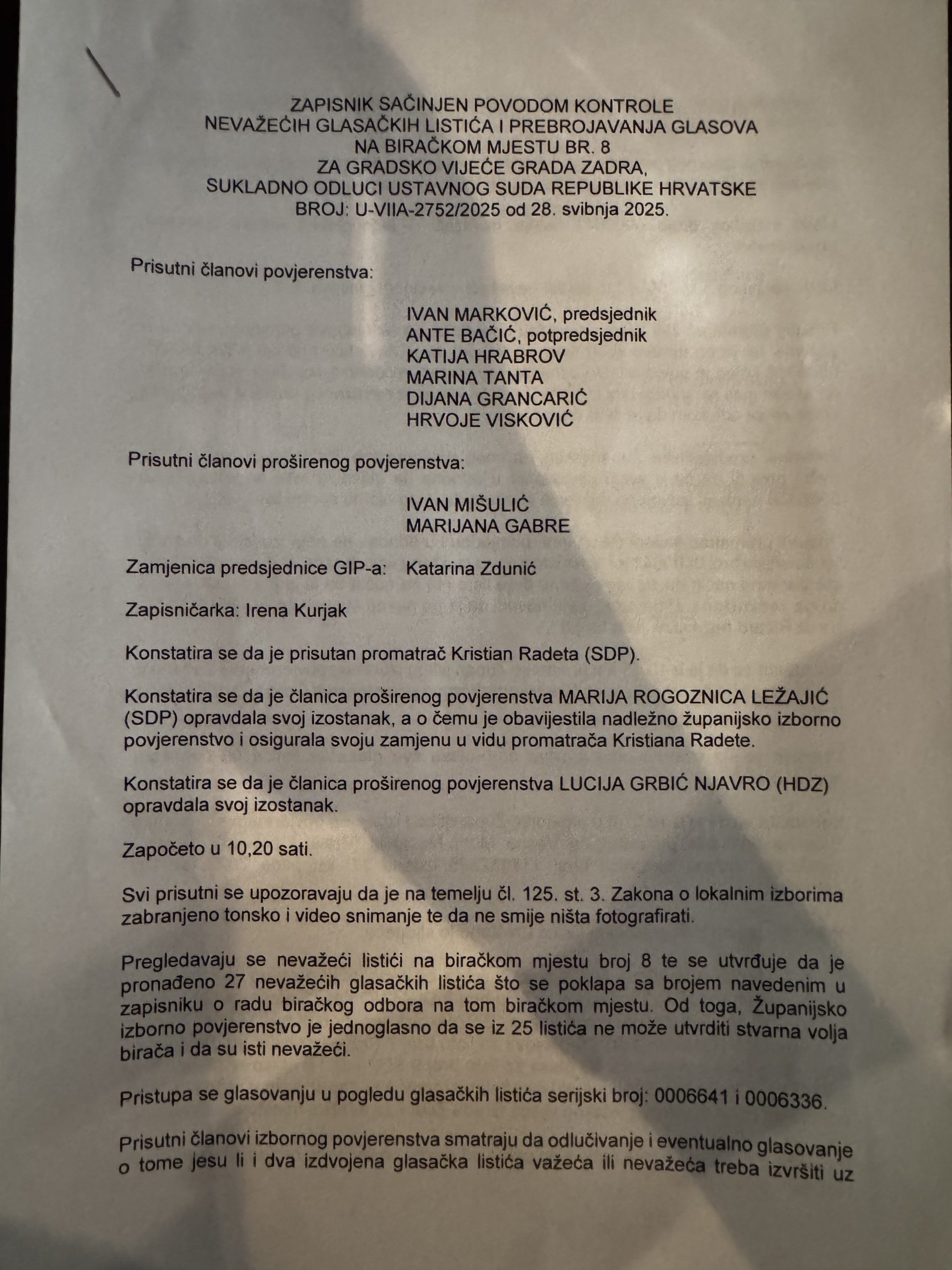 Naime, Ustavni sud Republike Hrvatske svojom odlukom poslovni broj U-VII-2752/2025 od 28. svibnja 2025. godine donio Odluku kojom je prihvaćena žalba SDP-a podnesena protiv rješenja Županijskog izbornog povjerenstva Zadarske županije Klasa:012-07/25-01/3, Ur.br.: 2198-10-25-66 od 25. Svibnja2025. kojim je moj prigovor bio odbačen kao nepravovremen. Predmet je vraćen ovom izbornom povjerenstvu na ponovni postupak , s tim što je istovremeno naloženo Županijskom izbornom povjerenstvu Zadarske županije izvršiti kontrolu nevažećih glasačkih listića, i prebrojavanje glasova za Gradsko vijeće Grada Zadra na biračkom mjestu br. 8, provedenim 18. Svibnja 2025. godine.