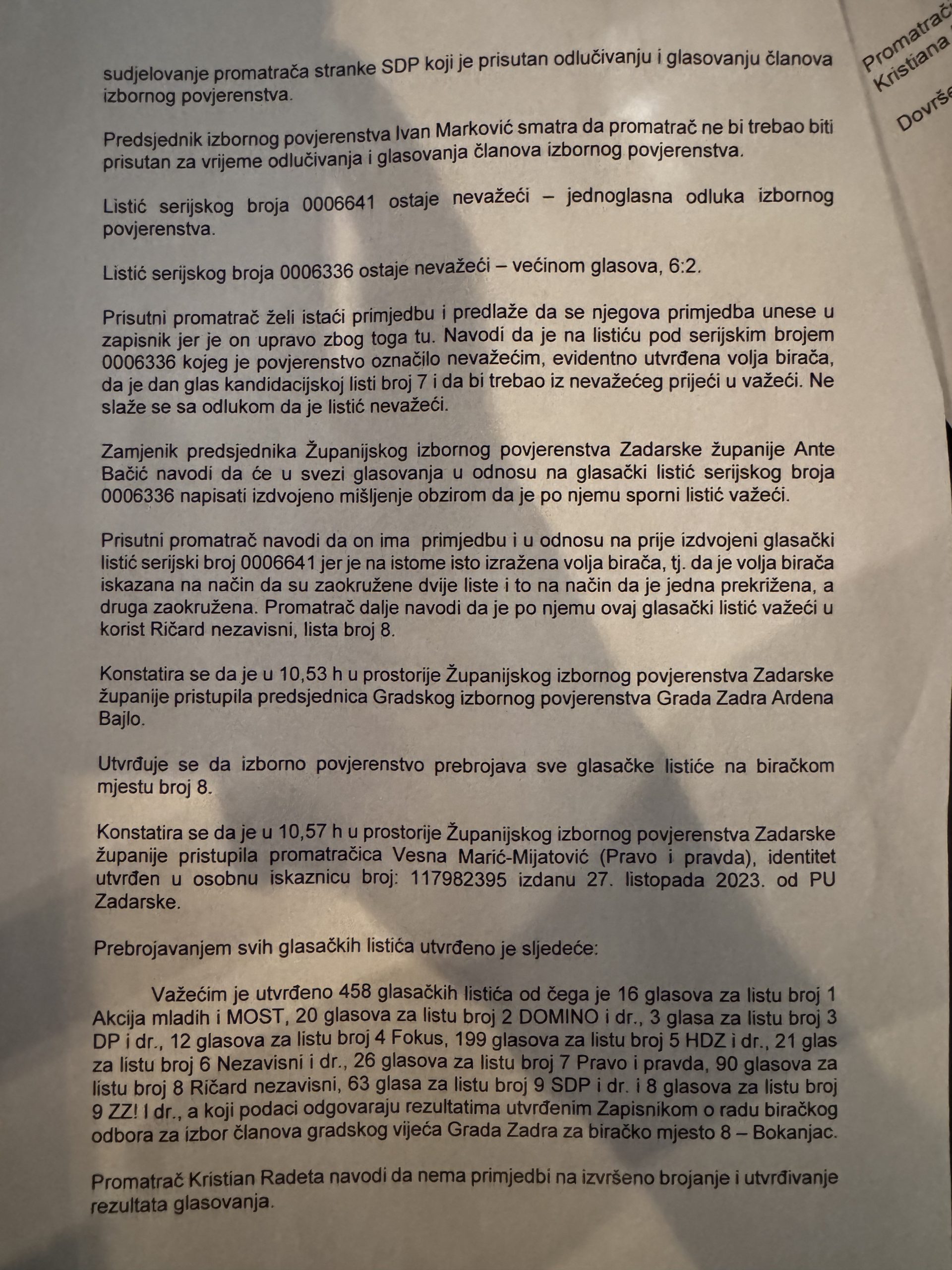 Naš Promatrač Kristijan Radeta ističe primjedbu i predlaže da se njegova primjedba unese u zapisnik jer je on upravo tu zbog te nepravilnosti s listićem. Navodi kako je na listiću pod serijskim brojem 0006336 kojeg je povjerenstvo označilo nevažećim, evidentno utvrđena volja birača, te da je jedan glas koji nedostaje kandidacijskoj listi broj 7 za ulazak u Gradsko vijeće Grada Zadra neosporan i važeći listić koji treba biti pribrojan ukupnom rezultatu.
