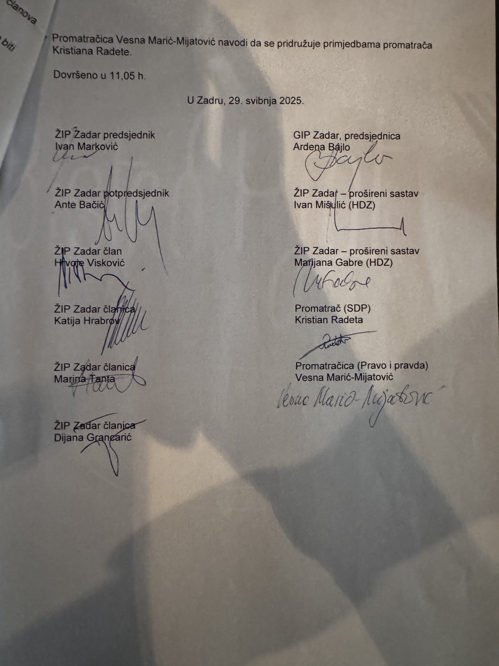 Dana 29. svibnja 2025. Godine održana je sjednica Županijskog izbornog povjerenstva Zadarske županije na kojoj je bio nazočan Promatrač SDP-a Kristijan Radeta, kao i promatračica stranke Pravo i Pravda Vesna Marić Mijatović. Od Gradskog izbornog povjerenstva Grada Zadra zatražen je kompletan izborni materijal . Uvidom u izborni materijal utvrđeno je sve ono što je utvrđeno i zapisnikom na dan izbor, međutim ostaje sporan detalj koji je i predmet ove žalbe, a to je jedan sporan listić koji je proglašen nevažećim , a naknadnim utvrđivanjem našeg Promatrača osporen je i evidentiran u zapisniku naknadnim pregledavanjem kao važeći listić za kandidacijsku listu pod rednim br. 7.
