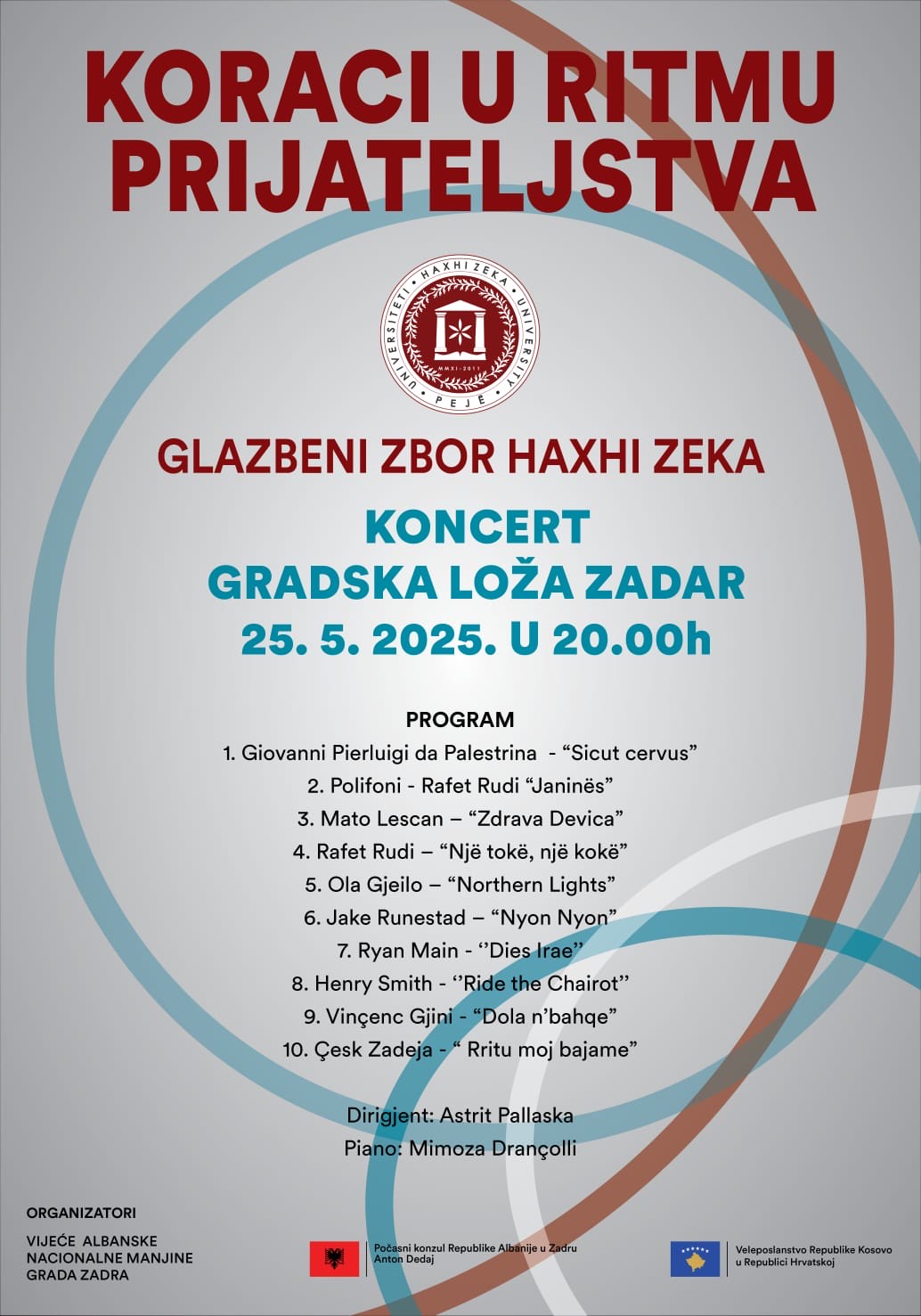 Koncert izvodi sveučilišni glazbeni zbor sa Sveučilišta Haxhi Zeka iz Peći, pod ravnanjem dirigenta Astrita Pallaske. Program obuhvaća raznolike skladbe na albanskom, engleskom i hrvatskom jeziku, simbolično povezujući kulture kroz glazbu i prijateljstvo.