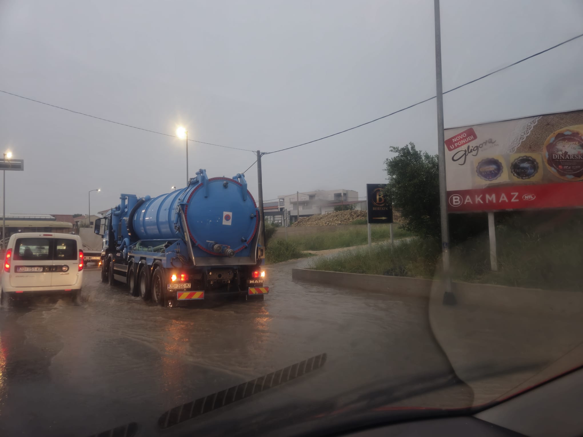 Jedan dan kiše, ni tjedan, ni tropska oluja, ni vremenski ekstrem kakav gledaš na National Geographicu, nego samo običan, žestok pljusak koji je bio najavljen. I svejedno, potopljena je zadarska obilaznica kod Bilog briga, dvorišta plivaju, automobili kao da plutaju, a cisterna pokušava crpiti vodu s ceste. Ali vode ima previše i sudeći po slici, pobjeđuje.