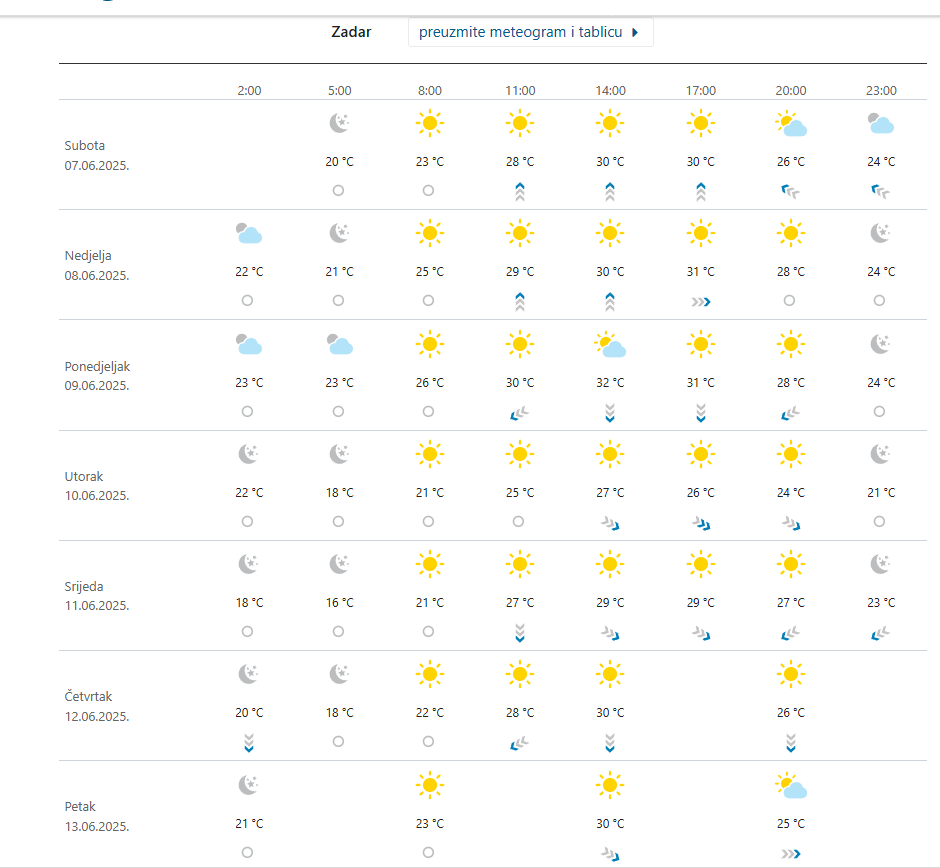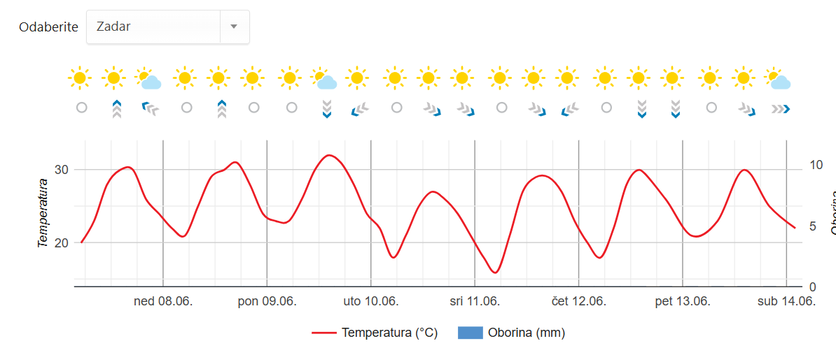 METEO PRILIKE VIKENDA Ljeto uranilo dva tjedna, vrućina, sparina, u ponedjeljak ili ‘fen’ ili ‘hladnjak’. Evo nam i tjedna prognoza za Zadar!
