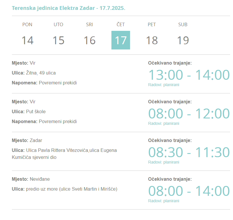 Elektra Zadar izvijestila je o privremenoj obustavi isporuke el.energije zbog izvođenja radova sutra, u četvrtak, 17. srpnja, na području više županijskih naselja i ulica.