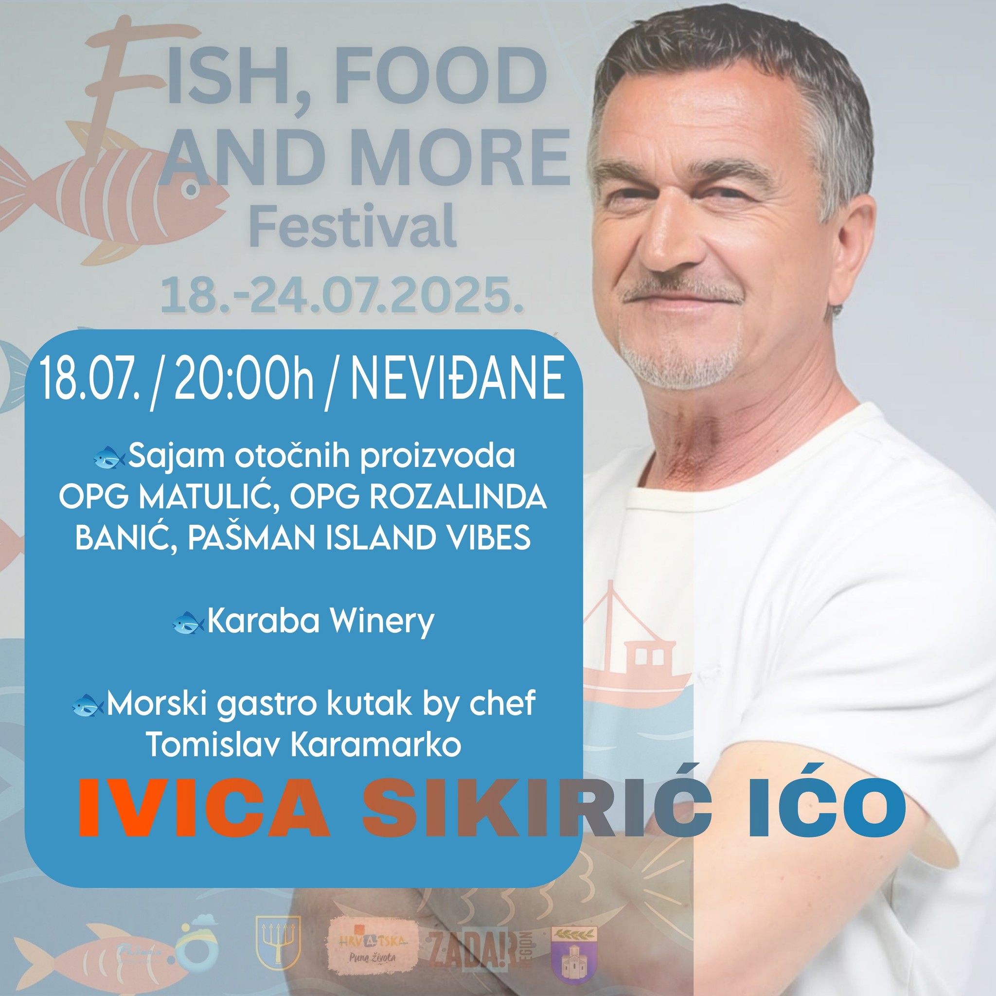 Gastro kutak večeri predvodit će poznati chef Tomislav Karamarko, koji će pripremati riblja jela inspirirana morem i lokalnom tradicijom – svježe, kreativno i neodoljivo ukusno. More će doista biti na tanjuru, a mirisi i okusi podsjetit će zašto je mediteranska kuhinja među najcjenjenijima u svijetu. Uz njega, poseban ugođaj donosi i sajam otočnih proizvoda na kojem će posjetitelji moći kušati i ponijeti sa sobom djelić Pašmana – domaće likere, džemove, kozmetiku, začine i suvenire koje potpisuju OPG Matulić, OPG Rozalinda Banić i kreativci iz inicijative Pašman Island Vibes…