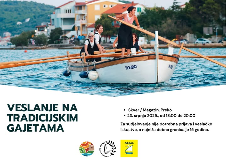 Veslanje će se održavati na lokaciji Magazin u Preku, svakodnevno od 18 do 20 sati, a ono što ovu aktivnost čini posebno privlačnom jest činjenica da nije potrebna nikakva prethodna prijava ni iskustvo. Dovoljna je tek dobra volja, malo entuzijazma i želja za povezivanjem s morem na jedan iskonski način. Gajete Palmina i Rosanda nisu samo plovila – one su pokretna baština, naslijeđe koje se prenosi s generacije na generaciju i kojem se svi mogu približiti kroz vlastito iskustvo.