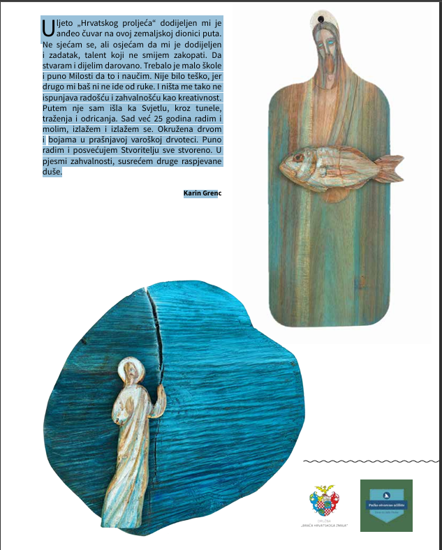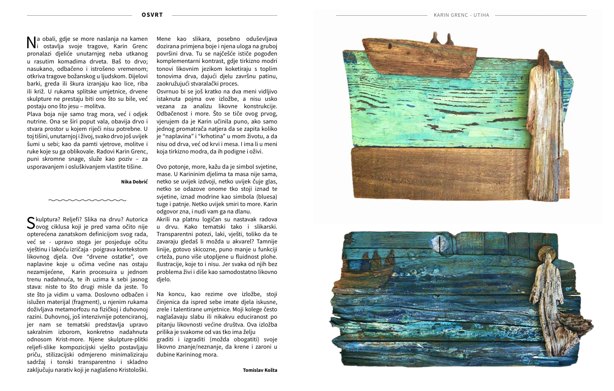 Večer će, uz izložbu, oplemeniti i nastup ženske klape Lavandiere iz Preka. Radovi Karin Grenc – skulpture, reljefi i slike na drvu – nastaju od naplavina, starih greda i komada barki koje umjetnica pronalazi na obali. U njenim rukama ti odbačeni i vremenom izlizani fragmenti dobivaju novi život i postaju tiha molitva. Plavetnilo boje, poput odjeka mora i nutrine, obavija grubu teksturu drva stvarajući prostor u kojem nisu potrebne riječi.