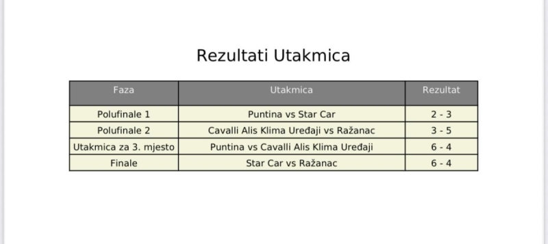 Na turniru su sudjelovale ekipe: Puntina, Star Car, Cavalli Alis Klima Uređaji i Ražanac, a nakon niza zanimljivih i borbenih utakmica, ostvareni su sljedeći rezultati: prvo mjesto i janjca osvojila je ekipa Star Car, drugo mjesto i pršut pripalo je ekipi Ražanac dok je treće mjesto, uz paški sir, zauzela ekipa Puntina.