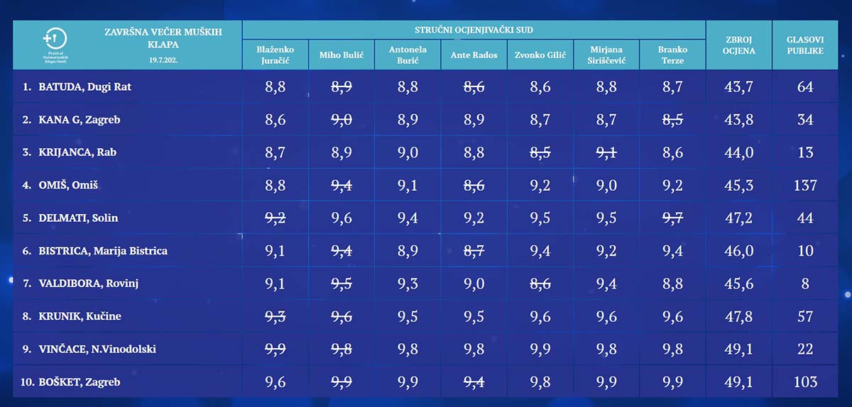 Na ovogodišnjem Festivalu dalmatinskih klapa u Omišu, klapa Bošket osvojila je Zlatni štit stručnog žirija po treći put zaredom – čime su potvrdili status jedne od najkvalitetnijih klapa u RH. Publika im je na Velikoj pjaceti podno drevne Mirabele dodijelila i Srebrni leut, a upravo to dvostruko priznanje iz godine u godinu najbolje govori o njihovoj umjetničkoj snazi i emociji koju prenose slušateljima…