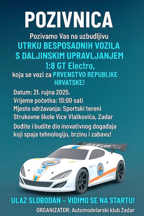 Organizator događanja, Automodelarski klub Zadar, poziva sve građane, velike i male, da dođu i uživo svjedoče ovom jedinstvenom natjecanju. Utrke u kategoriji 1:8 GT Electro donose vrhunske modele, munjevitu dinamiku i preciznu vožnju kojom upravljaju natjecatelji iz cijele RH. Posebna čar ovih vozila je to što spajaju vrhunsku tehnologiju i sportsku strast, a publika će imati priliku vidjeti koliko daleko ide inovacija kada se spoji znanje, vještina i pozitivna ljubav prema brzinama.