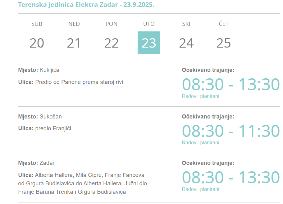Elektra Zadar izvijestila je o privremenoj obustavi isporuke el.energije zbog izvođenja radova sutra, u utorak, 23. rujna, na području gradskih i županijskih naselja i ulica.