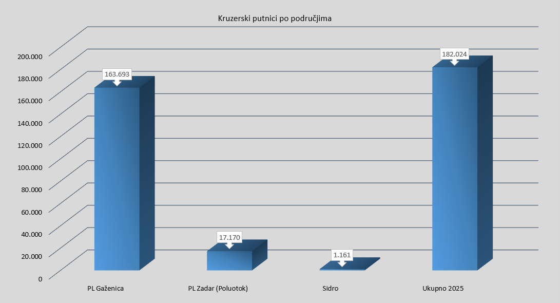 Proteklog vikenda, točnije 13. rujna 2025., Lučka uprava Zadar u svojim je dvjema putničkim lukama (PL Zadar – Poluotok i PL Gaženica) i sidrištima kojima upravlja, dosegla i premašila brojku od 200.000 putnika s kruzera u ovoj kalendarskoj godini. Ova je brojka realizirana ranije nego prošle godine, kada je ista ostvarena 26. rujna 2024.