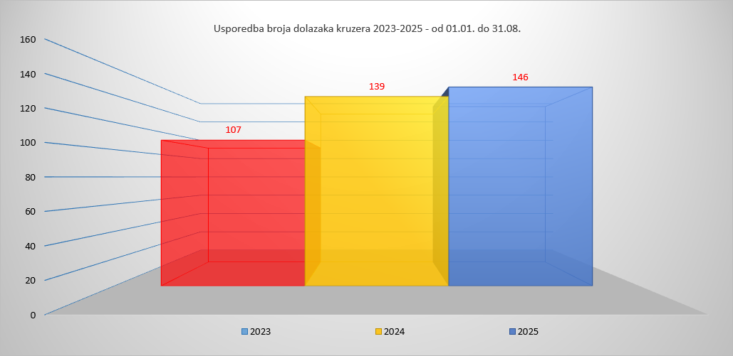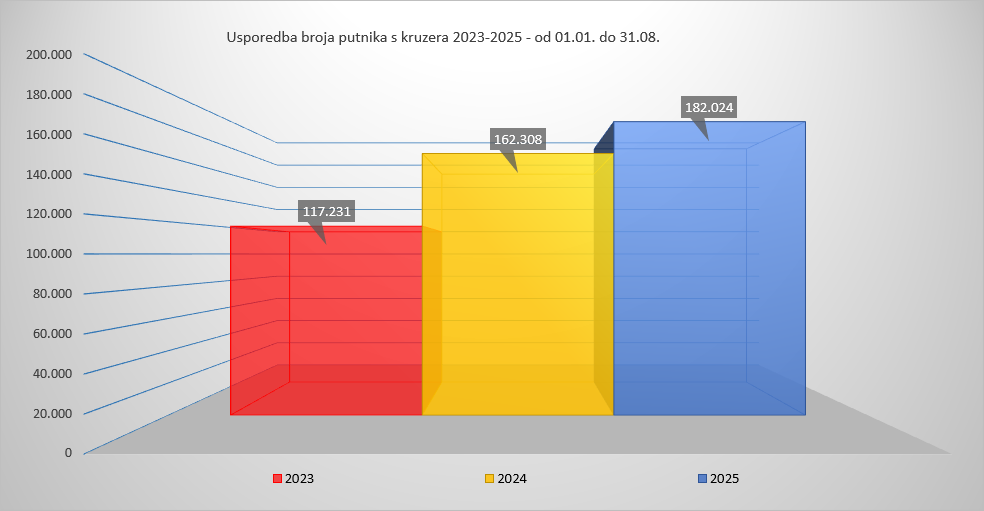 A što se tiče samog broja kruzera, do 31. kolovoza zabilježeno je 146 dolazaka, ili 5,04 posto više nego u istom razdoblju lani. Zaključno s 15. rujna 2025., ostvareno je ukupno 164 dolazaka kruzera sa 208.875 putnika i putnica.