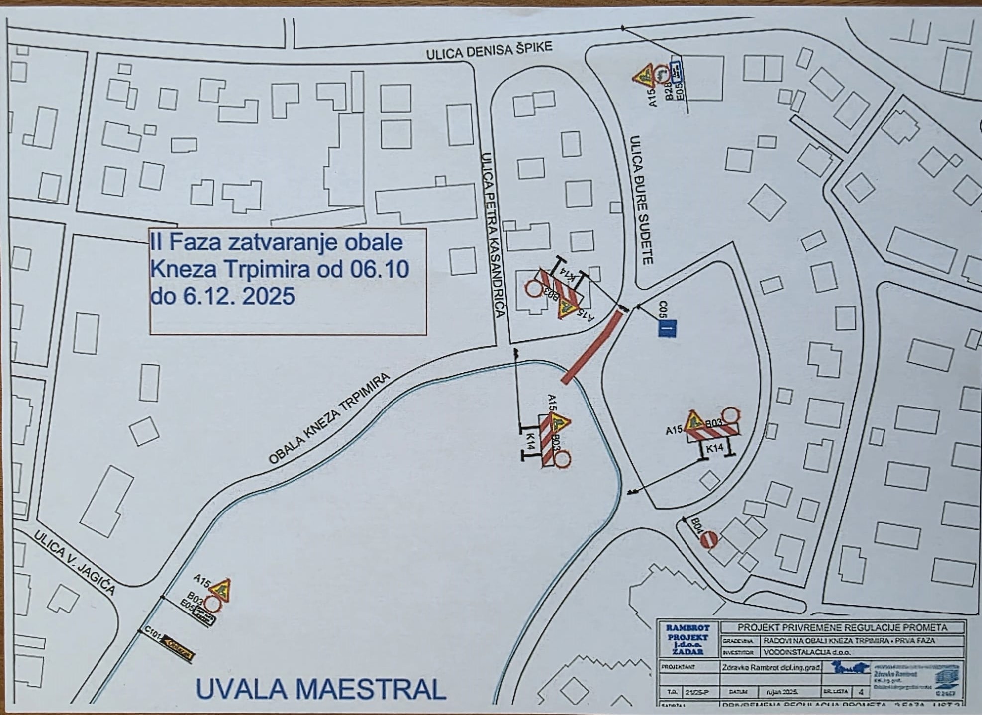 Najprije se zatvara  ulica  Đure Sudete do 6.10.2025., a nakon toga Trpimirova obala do 06.12.2025. Javni autobusni prijevoz će biti organiziran kroz ulicu Denisa Špike. U dječji vrtić Grigor Vitez će se moći doći i otići iz ulice Denisa Špike.