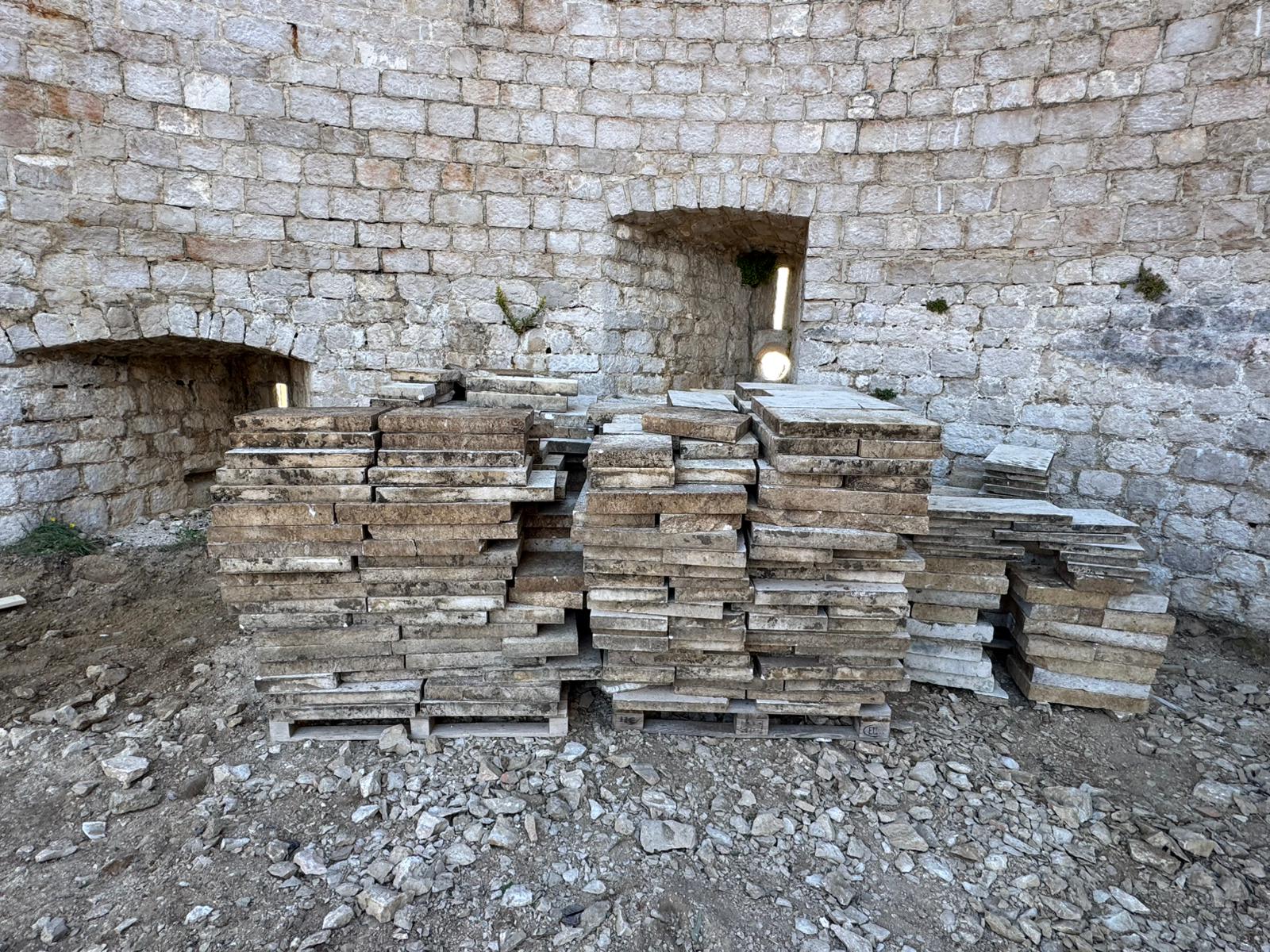 Obuhvaćaju i pažljivu razgradnju postojećeg kamenog opločenja, potpornih zidova, parapeta i dijelova bedema, uz zadržavanje maksimalnog broja izvornih kamenih blokova. Također i sanaciju i rekonstrukciju kamenih zidova i bedema u skladu s konzervatorskim smjernicama.