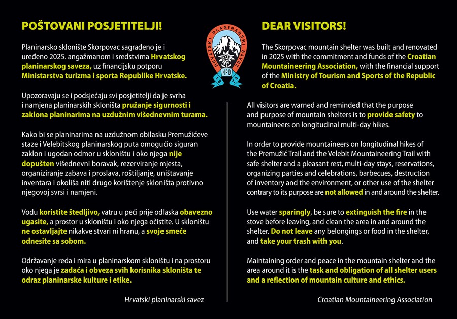 Hrvatski planinarski savez poziva sve planinare i ljubitelje Velebita na svečano otvorenje planinarskog skloništa Skorpovac na srednjem Velebitu u subotu 18. listopada s početkom u 13 sati.