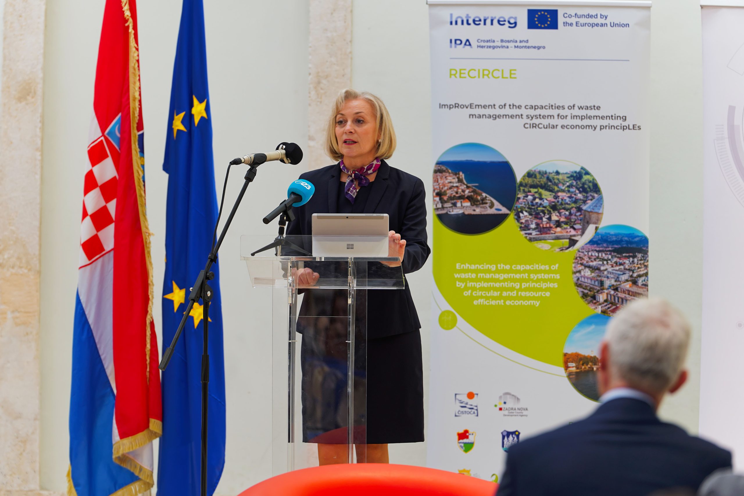 Uvodno se okupljenima obratila ravnateljica Agencije ZADRA NOVA, Marina Dujmović Vuković, koja je istaknula važnost projekata poput RECIRCLE-a u podizanju svijesti o odgovornom gospodarenju otpadom – „Svaki Europljanin godišnje u prosjeku proizvede oko 190 kilograma ambalažnog otpada. Brojke su ovo koje brinu i pozivaju na reakciju. Europska unija postavila je cilj – izgraditi kružno i klimatski neutralno gospodarstvo do 2050. Kako bi se to postiglo, EU je posljednjih godina uvela brojne nove mjere za smanjenje otpada i povećanje održivosti proizvoda. Od sustava „uzmi-proizvedi-potroši-baci” cilj je doći do sustavu u kojem se ponovna upotreba, popravak, recikliranje i obnova stavljaju u središte. EU projekti svojim aktivnostima doprinose tom cilju, a među njima i naš RECIRCLE. Osim novih spremnika za odvojeno prikupljanje otpada, fokus je i na edukacijama i promjeni modela ponašanja.“ – poručila je ravnateljica Dujmović Vuković.
