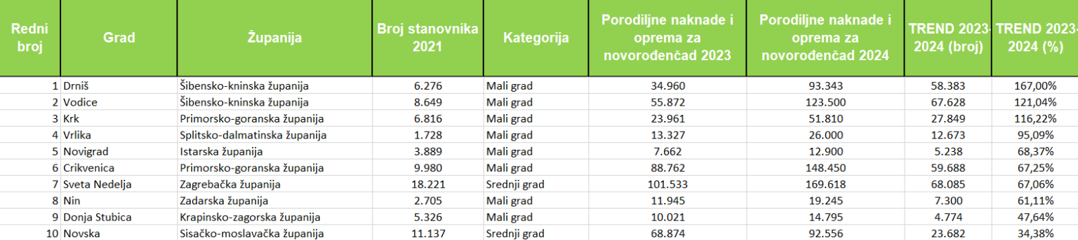 Sredstva za rodiljne naknade te opremu za novorođenčad lani su povećala 33 grada. Promatramo li porast izdvajanja u postotcima, apsolutni rekorder je Drniš, koji izdvajanja povećava za čak 167 posto. Slijede ga Vodice (121,04 posto), Krk (116,22 posto), Vrlika (95,09 posto) i Novigrad (88,37 posto). U Top 10 ulaze i Crikvenica (67,25 posto), Sveta Nedelja (67,06 posto), Nin (61,11 posto), Donja Stubica (47,64 posto) i Novska (+34,38 posto izdvajanja)…