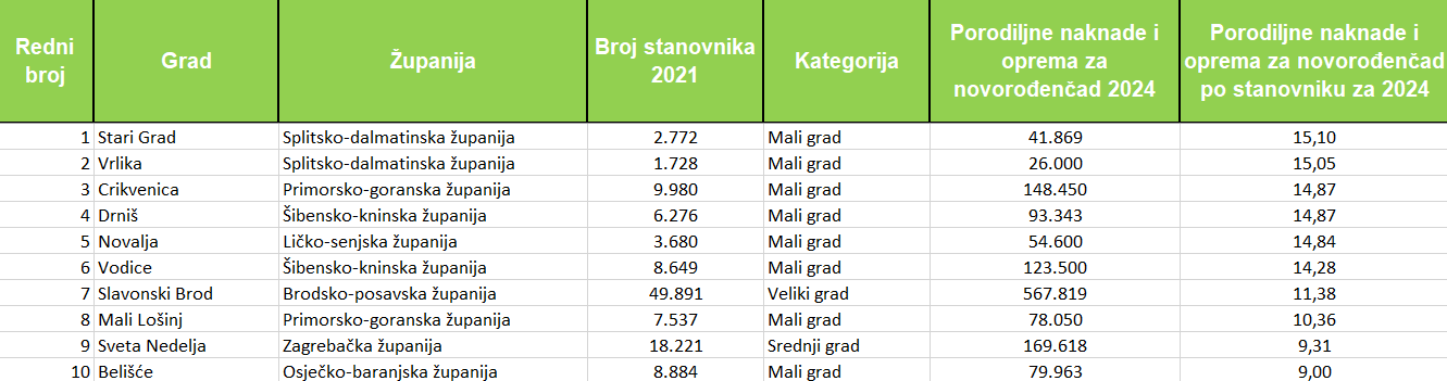 Sredstva za ovu namjenu izdvojilo je 60 gradova (u ukupnom iznosu od 4.276.520 eura, što je za 401.283 eura više nego u prethodnoj godini), ali važno je istaknuti da neki gradovi u ovoj kategoriji prikazuje nulte ili prazne iznose. Razlog nije izostanak demografskih mjera, već način knjiženja jer mnoge jedinice lokalne samouprave izdvajanja za novorođenčad evidentiraju pod širim stavkama socijalne skrbi ili općih potpora obiteljima. U ovoj analizi stoga prikazujemo samo one gradove koji su izdvajanja za Porodiljne naknade i opremu za novorođenčad izričito iskazali kao zasebnu proračunsku poziciju.