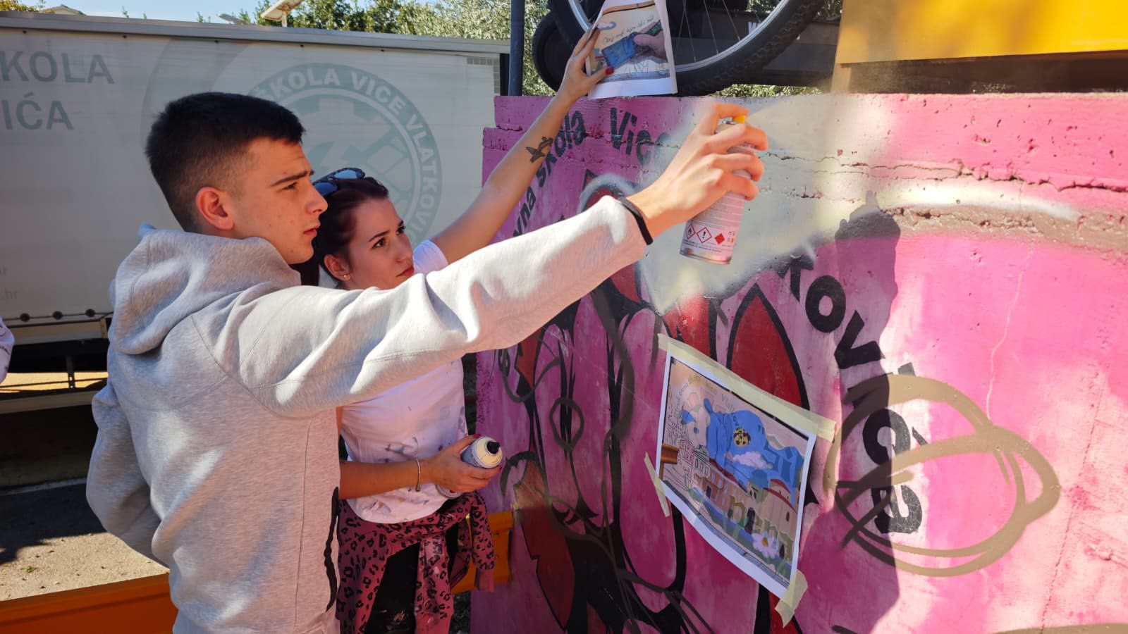 -Kad nam se muralistica javila s upitom za suradnju, nismo dugo razmišljali. Dogovor je pao brzo – naši soboslikari-ličioci iz 3.S razreda prihvatili su izazov i pokazali koliko su talentirani. Ovaj put nisu koristili klasične boje za zid, već profesionalne sprejeve, a prije početka rada Ružica im je objasnila što ulična umjetnost jest, a što nije, te gdje i kako ona dobiva svoj pravi smisao. I jesu li shvatili poruku? Mi mislimo da jesu. Dobili smo pravo umjetničko djelo u dvorištu škole – objavili su s ponosom iz ‘V. Vlatkovića’.