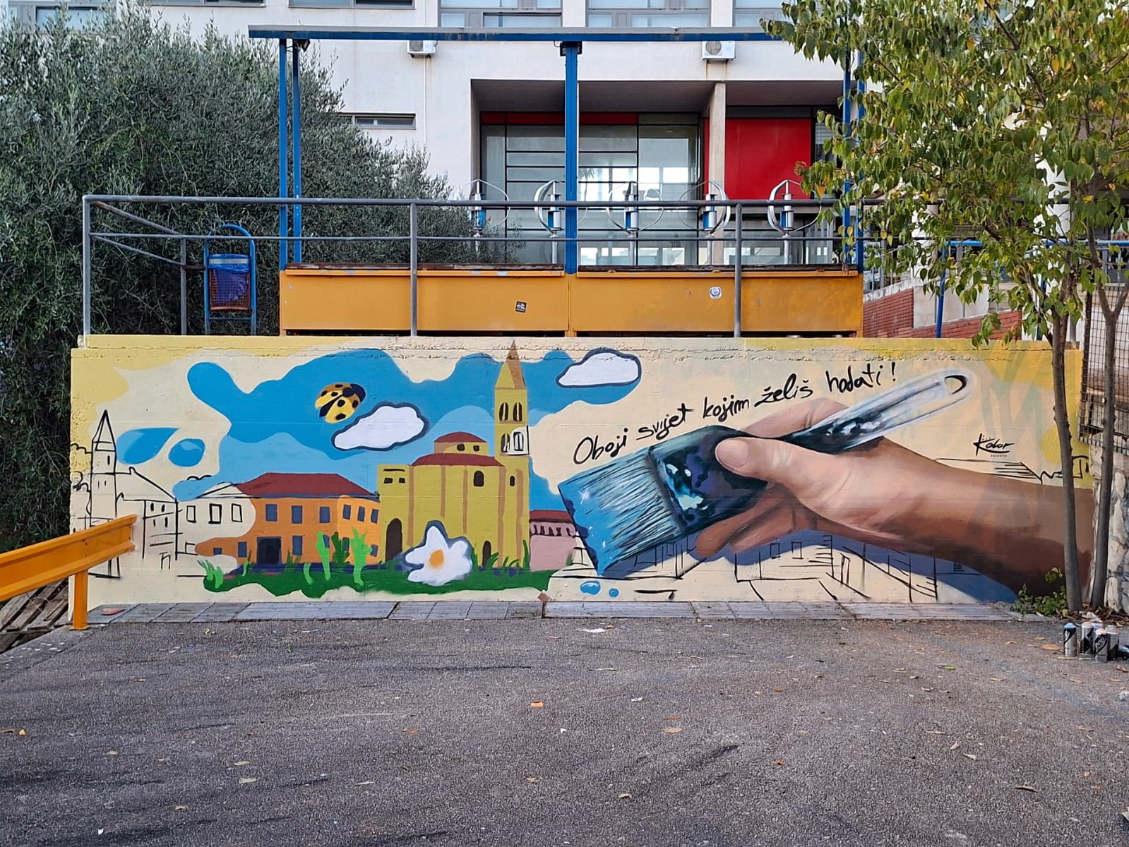 Dvorište Strukovne škole Vice Vlatkovića u Zadru od prošlog tjedna krasi novi mural – djelo učenika soboslikara-ličilaca iz 3.S razreda, nastao u minuli četvrtak pod mentorstvom poznate muralistice Ružice Segarić iz Kolor Kolektiva. Umjetnički projekt, koji nosi snažnu poruku “Oboji svijet kojim želiš hodati”, pretvorio je školski zid u pravo platno mladenačke energije, kreativnosti i optimizma, a Zadar je dobio još jedan vizualni dragulj koji spaja obrazovanje i umjetnost u najljepšem mogućem obliku.