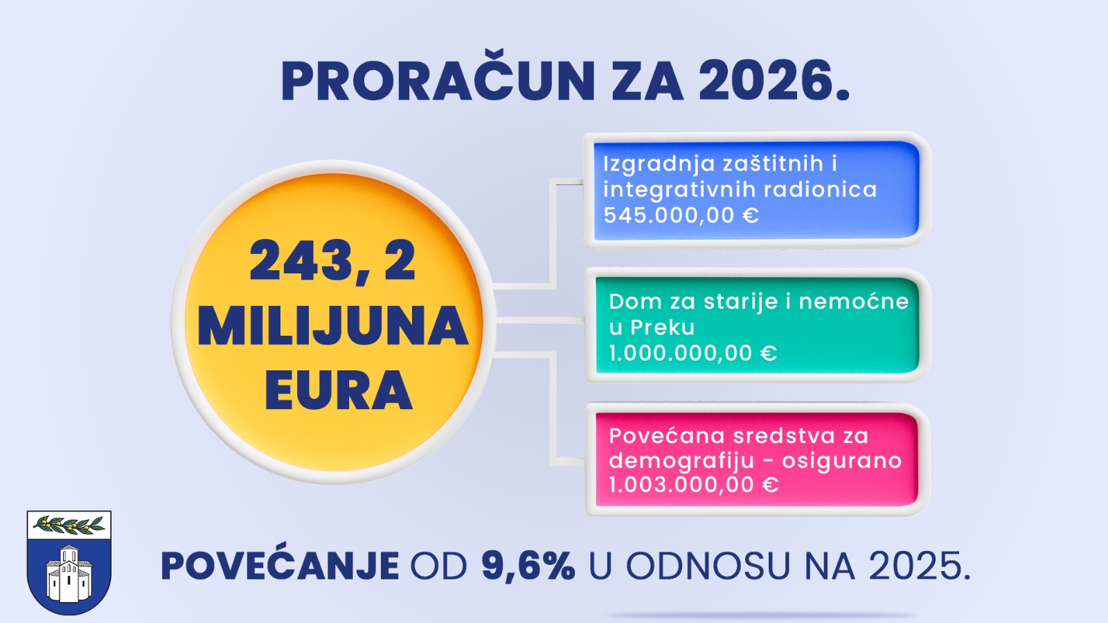 Pročelnik Upravnog odjela za hrvatske branitelje, udruge, demografiju i socijalnu politiku Josip Vidov najavio je povećanje demografskih mjera, s planiranim izdvajanjem od 1.003.000,00 eura u 2026. godini za jednokratne naknade za novorođenčad. To je značajan rast u odnosu na godinu ranije kada je u proračunu bilo osigurano 637 tisuća eura.