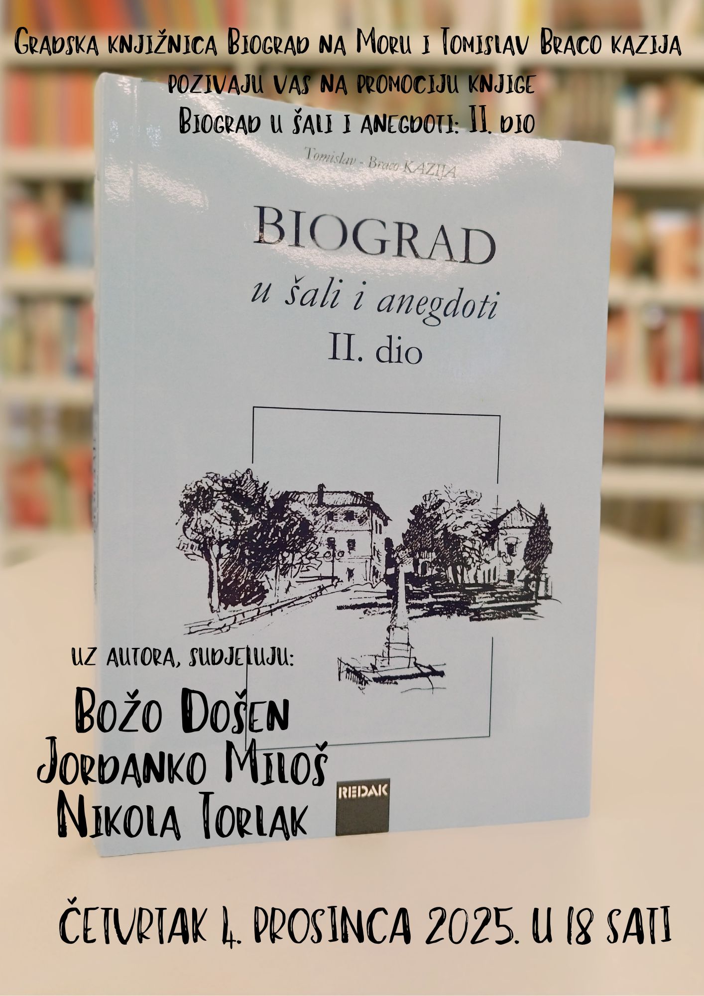 Gradska knjižnica Biograd na Moru poslala je poziv na promociju drugog dijela knjige Tomislava Brace Kazije “Biograd u šali i anegdoti“, koja će se održati u četvrtak 4. prosinca u 18 sati.