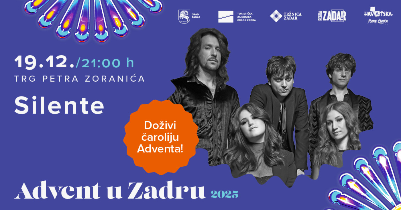 U petak, 19. prosinca, u 21 sat, na adventskoj pozornici na Trgu Petra Zoranića nastupa dubrovački bend Silente. Na glazbenoj sceni pojavili su se 2013. godine s hitom „Terca na tišinu“, a od tada su izgradili prepoznatljiv stil koji spaja poetične tekstove, melodične aranžmane i snažnu emociju.