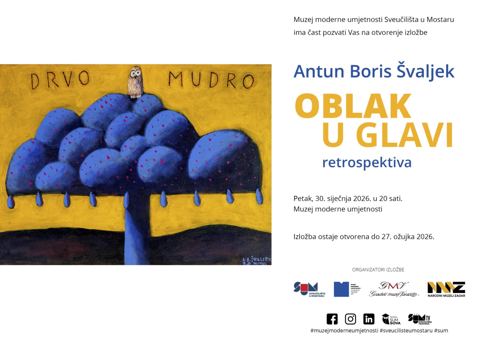 Muzej moderne umjetnosti Mostaru u suorganizaciji s Sveučilištem u Mostaru, Gradskim muzejom Varaždin i Narodnim muzejom Zadar najavljuje otvaranje retrospektivne izložbe “Oblak u glavi” Antuna Borisa Švaljeka, 30. siječnja 2026.g. u 20 sati.