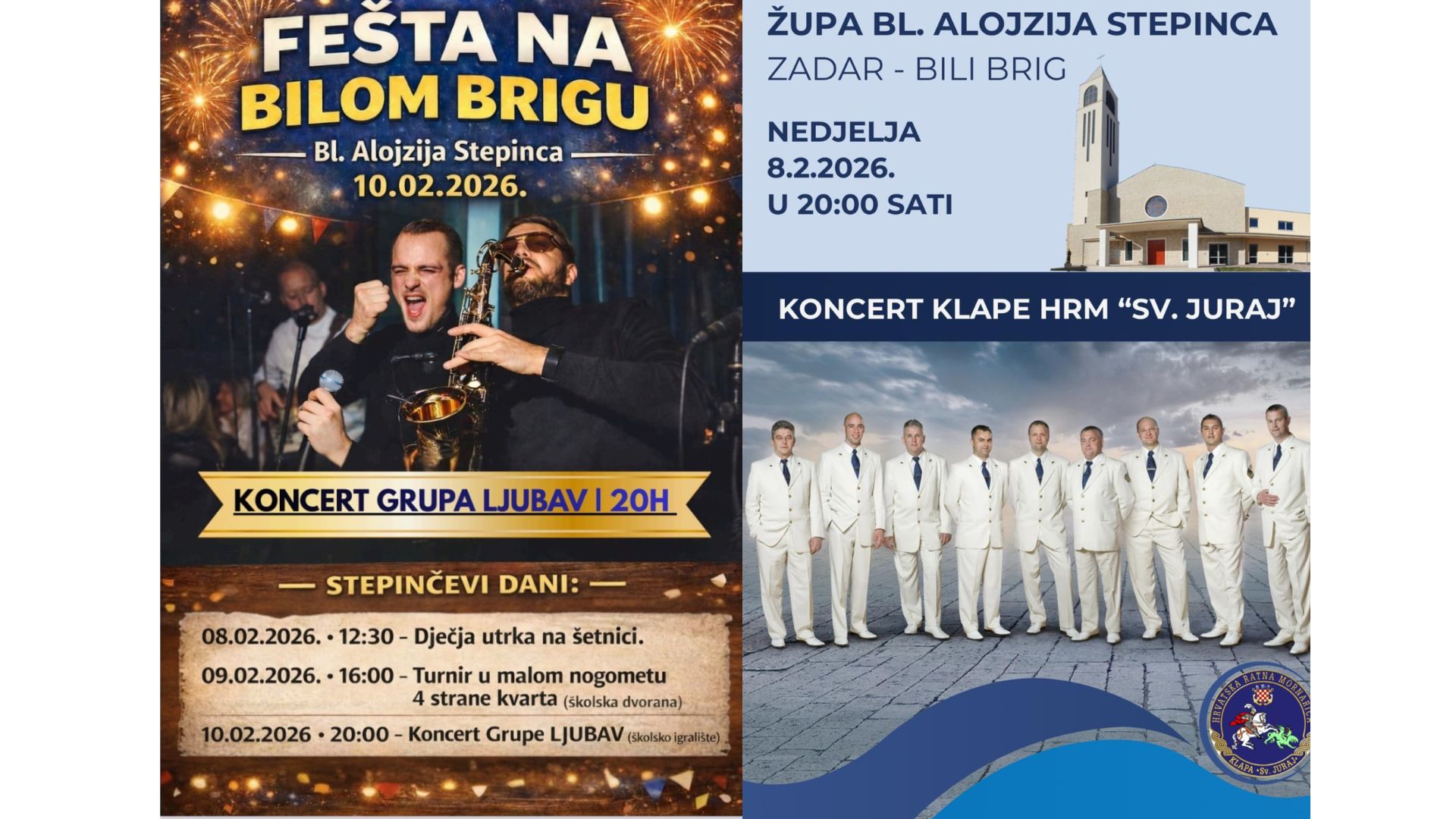 U nedjelju, 8. veljače u 20 sati, u Župi Alojzija Stepinca na Bilom brigu nastupit će Klapa HRM “Sv. Juraj”. Istoga dana na šetnici će se održati i dječja utrka.