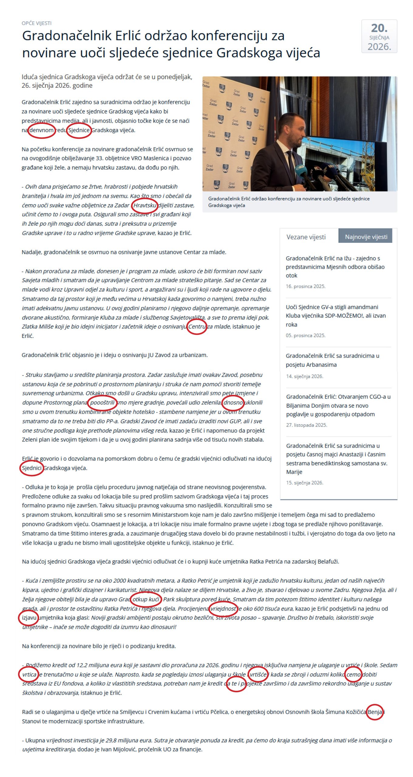 U današnjoj informaciji pod naslovom “Gradonačelnik Erlić održao konferenciju za novinare uoči sljedeće sjednice Gradskog vijeća”, već u letimičnom, površnom pregledu uočili smo više od 15 pravopisnih “bisera”!